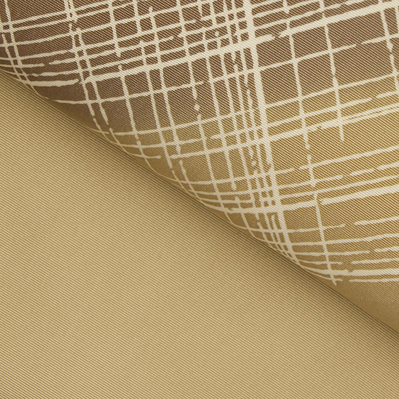 クリーミーなモカ茶系のベージュ・白茶色の上質な塩瀬の生地に、お太鼓の上から中心へ、そして下に向かって斜めの線で、グレー味のある淡い焦げ茶・空五倍子色に暈しで染め分けられ、それを覆うように手描きの糸目の線で細かい格子の模様が描かれた、シンプルな佇まいの中にも友禅の技術のレベルの高さとデザイン力が感じられる、素晴らしい九寸名古屋帯です。