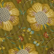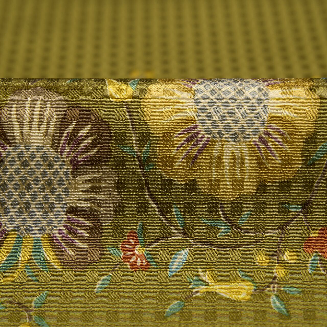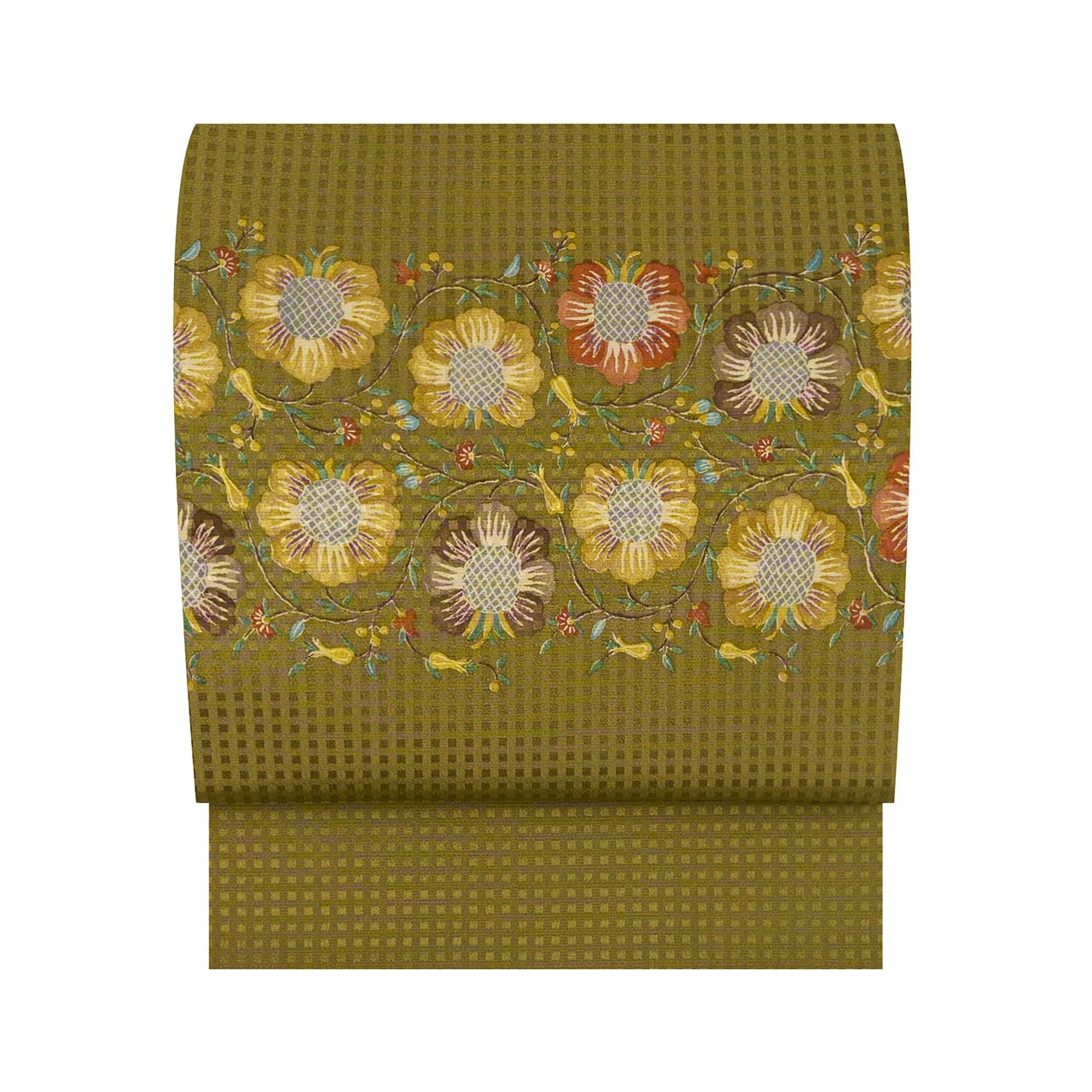 小さな四角が並んだ地模様が浮き織のように織り出された、鶯色系の緑・黄海松茶色の地に、細く太く段がとられ、そこにうねうねと蔓を広げて大きなお花をつけた蔓花模様が友禅で描かれた、素敵な九寸名古屋帯です。