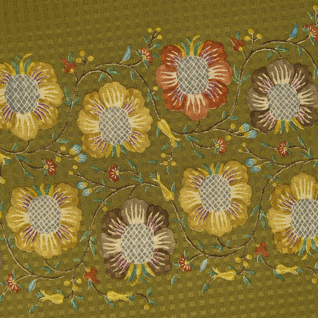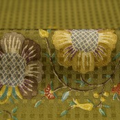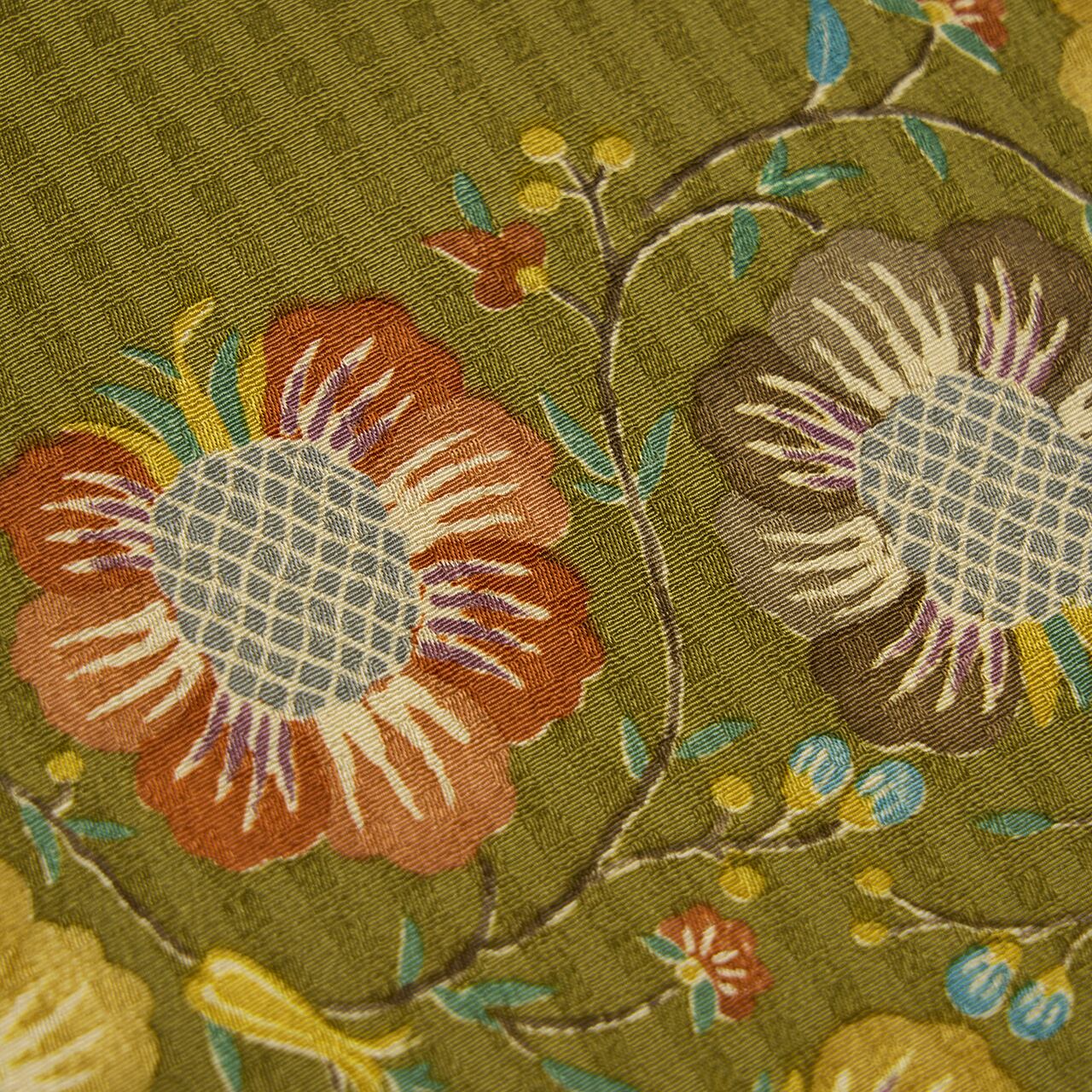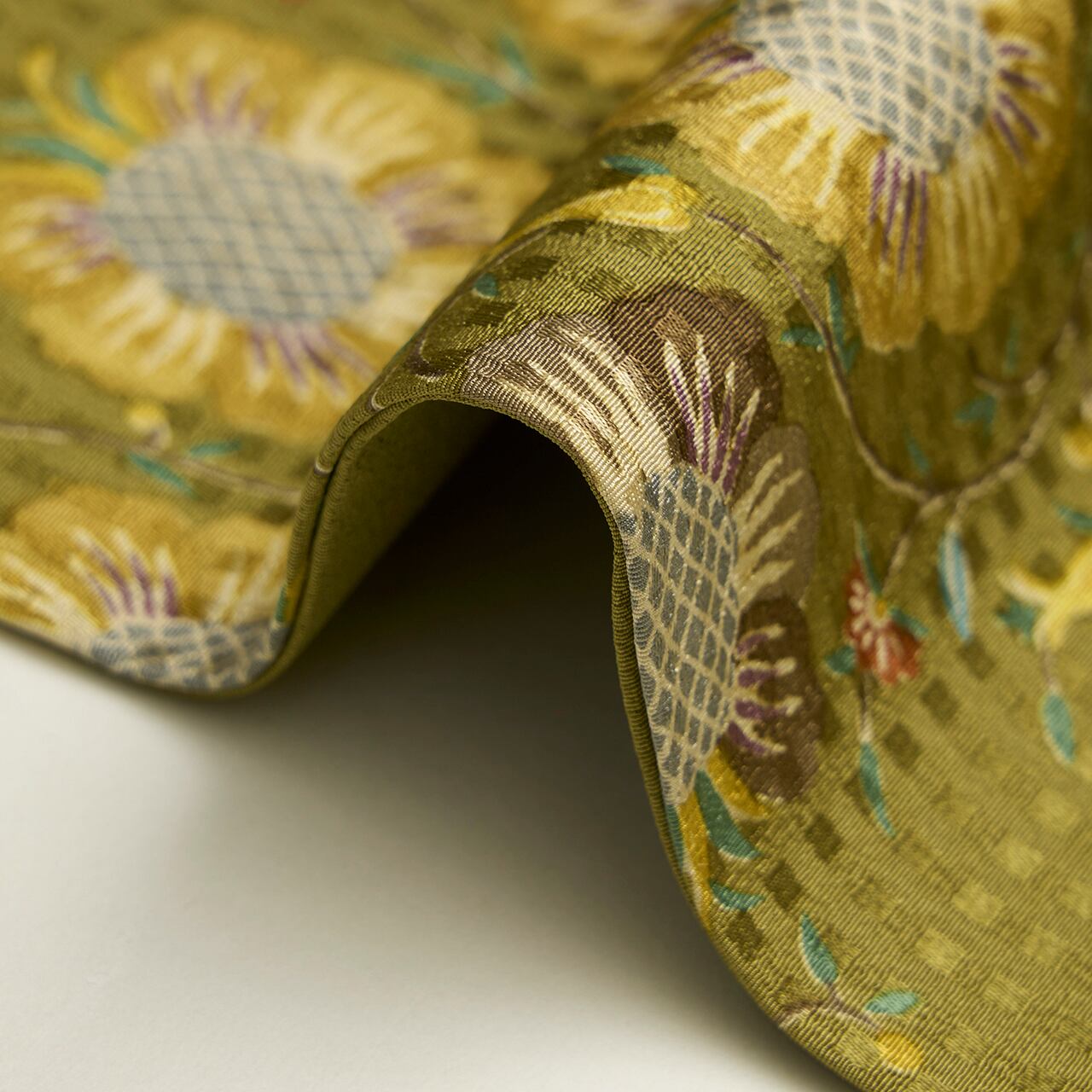 生地の小さな四角の地模様が綺麗な光沢を放っていて、その変化のある織りが綺麗に並んだお花をより引き立てているような奥行きも感じられる、お洒落な佇まいとなっています。