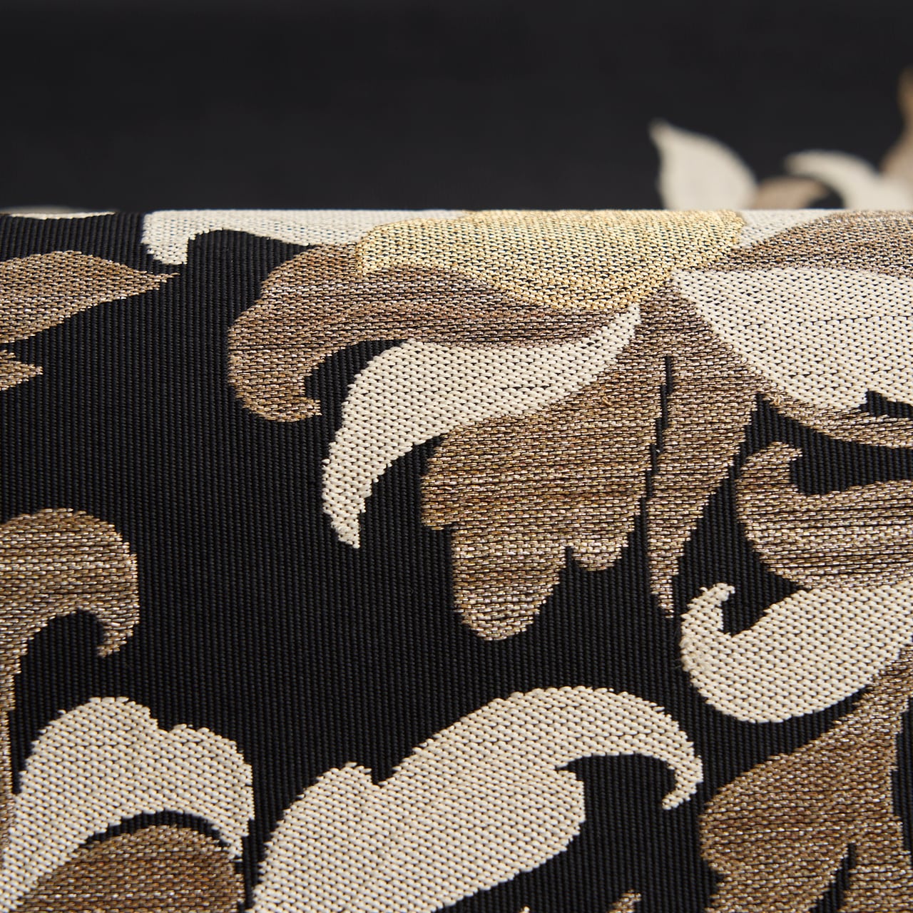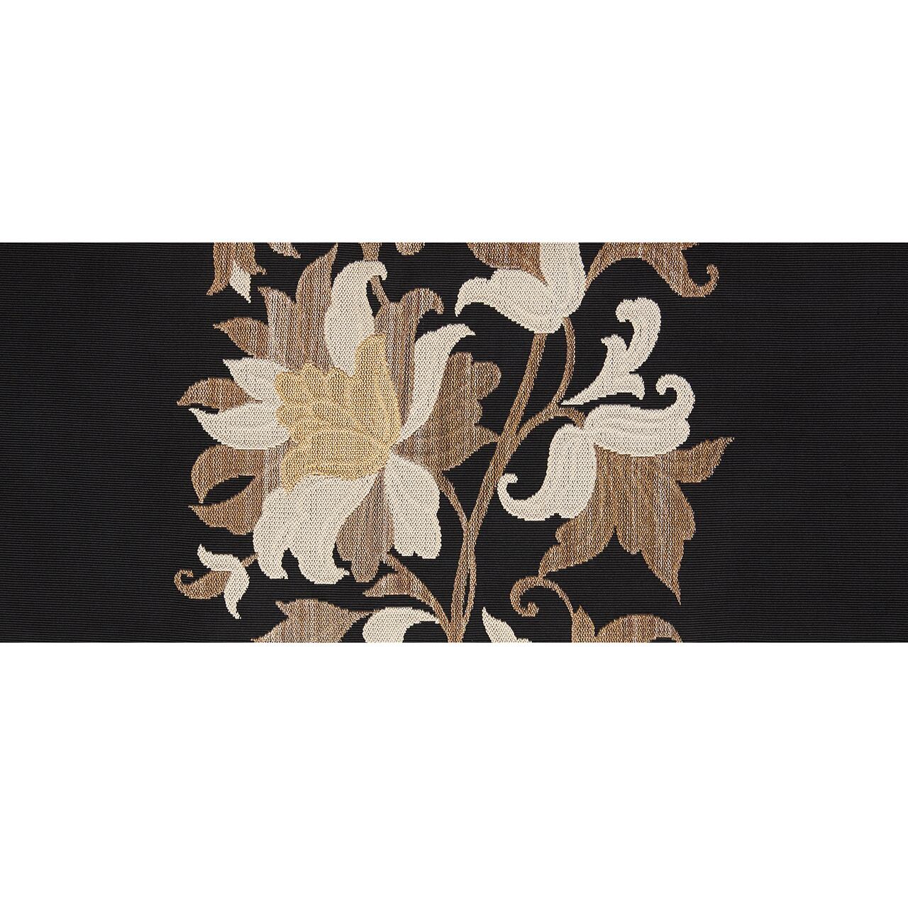 綴れ織のようなしっかりとした黒の地に、お太鼓には燻し金のような少し渋い茶鼠色の駒糸と、灰白色の糸で大胆な調子の花唐草の模様がくっきりと織り出され、お花の中心には金糸が織り込まれた、とてもメリハリのあるスカッとした雰囲気の、手機の品質の良い九寸名古屋帯です。
