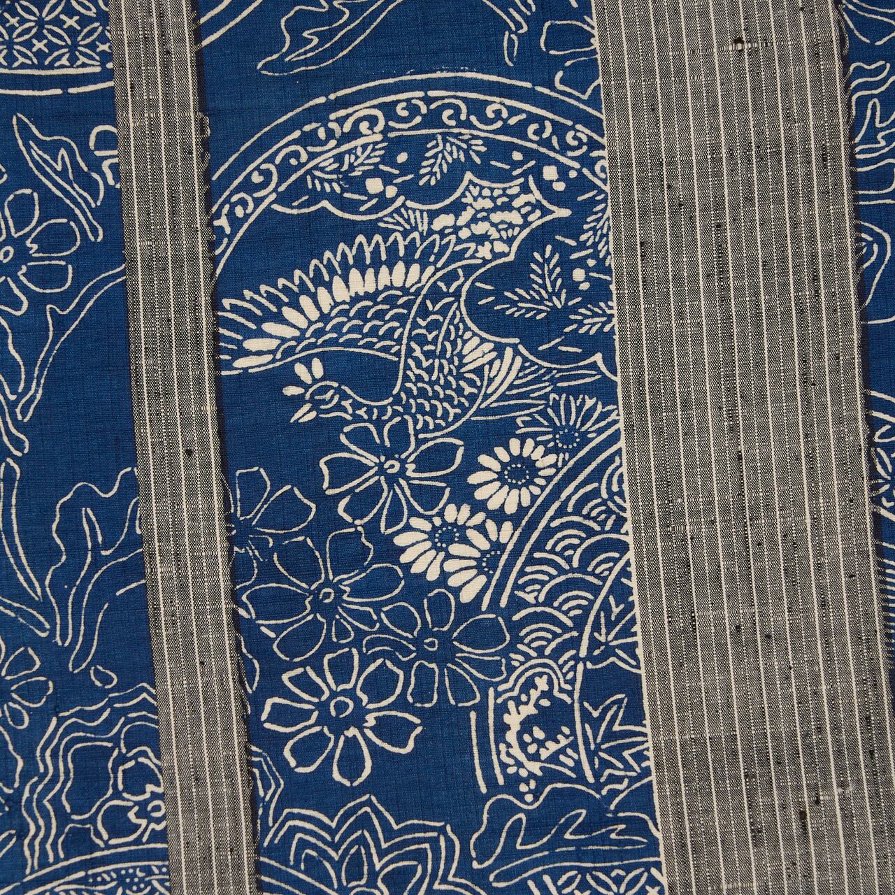 お太鼓の右寄りに約10cm、左寄りに約2.5cmの薄墨色の縞が織り込まれた紬地に、阿波の天然の藍を使用して、大きな鏡のような丸と草花の模様、そして鏡の中には菊、桐、鳳凰などの模様が型染めで染められた、大胆な模様が縞で区切られてとてもすっきりとしたお洒落な雰囲気の九寸名古屋帯です。