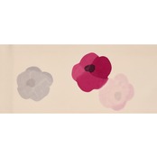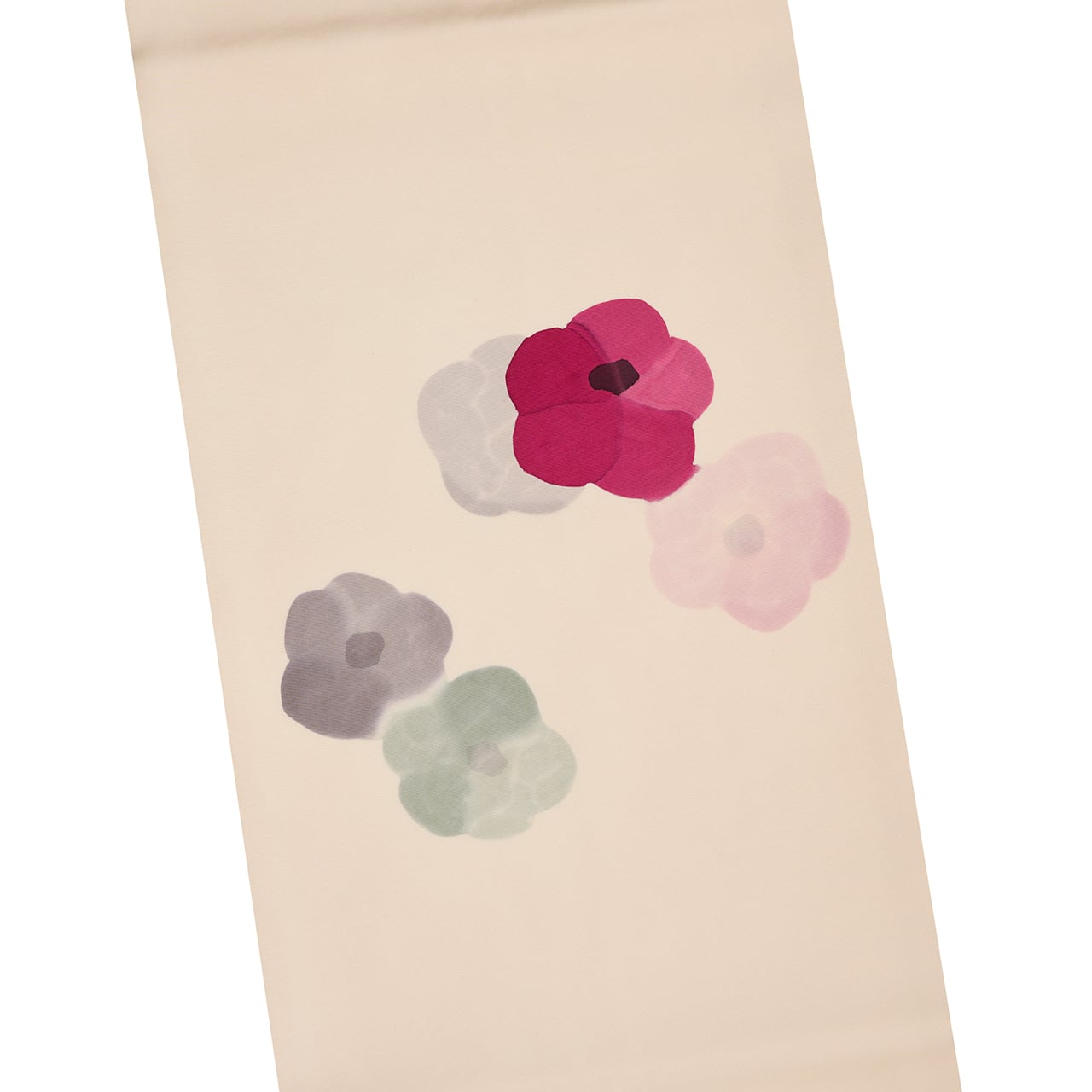 やわらかい生成り・象牙色の塩瀬の生地に、お太鼓には椿を思わせるような可愛らしい丸いお花が5つ、いろいろな色を使って手描きの蝋纈染めでふんわりと描かれた、素敵な九寸名古屋帯です。