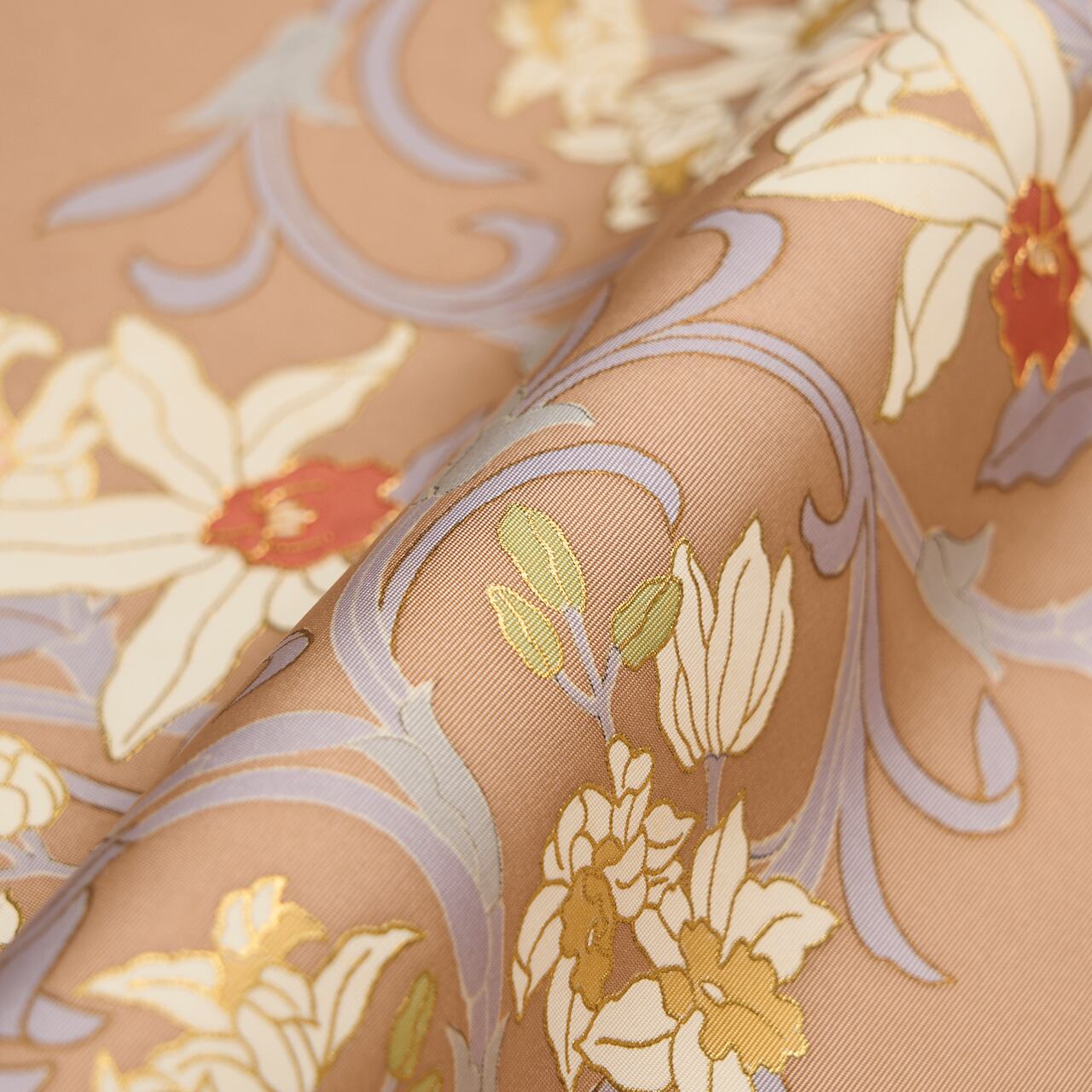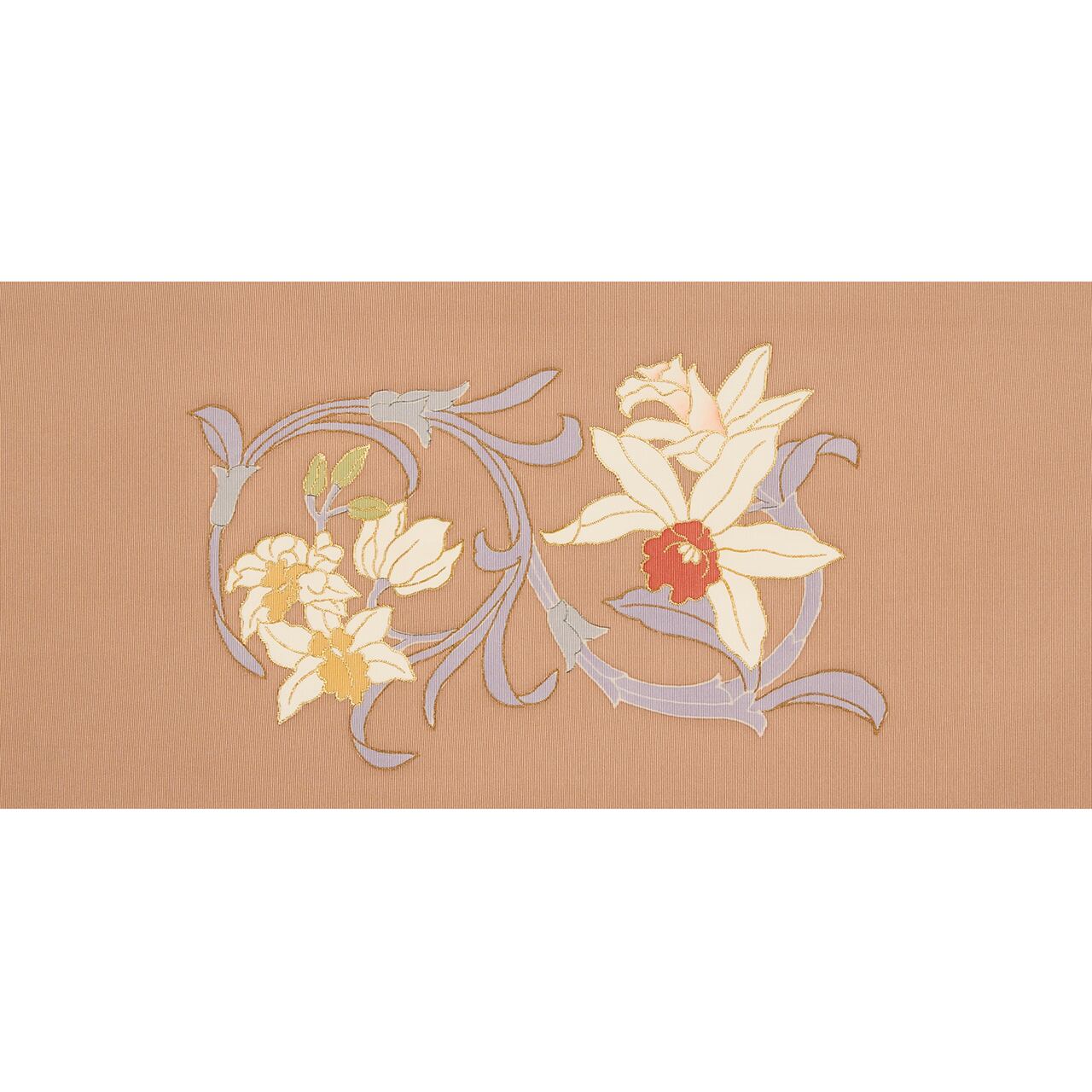 少し赤味のある淡い薄茶・アッシュローズのしっかりとした塩瀬の生地に、お太鼓にはカトレアの白いお花と、その茎や葉が蔓草のようにデフォルメされた模様が、手描きの友禅で描かれ、お花の中心には刺繍がされていたり、模様全体には金彩が施されたりして、さりげない華やかさがとても美しい素敵な九寸名古屋帯です。
