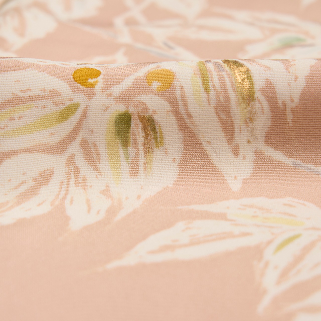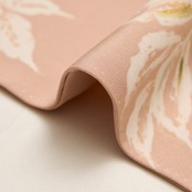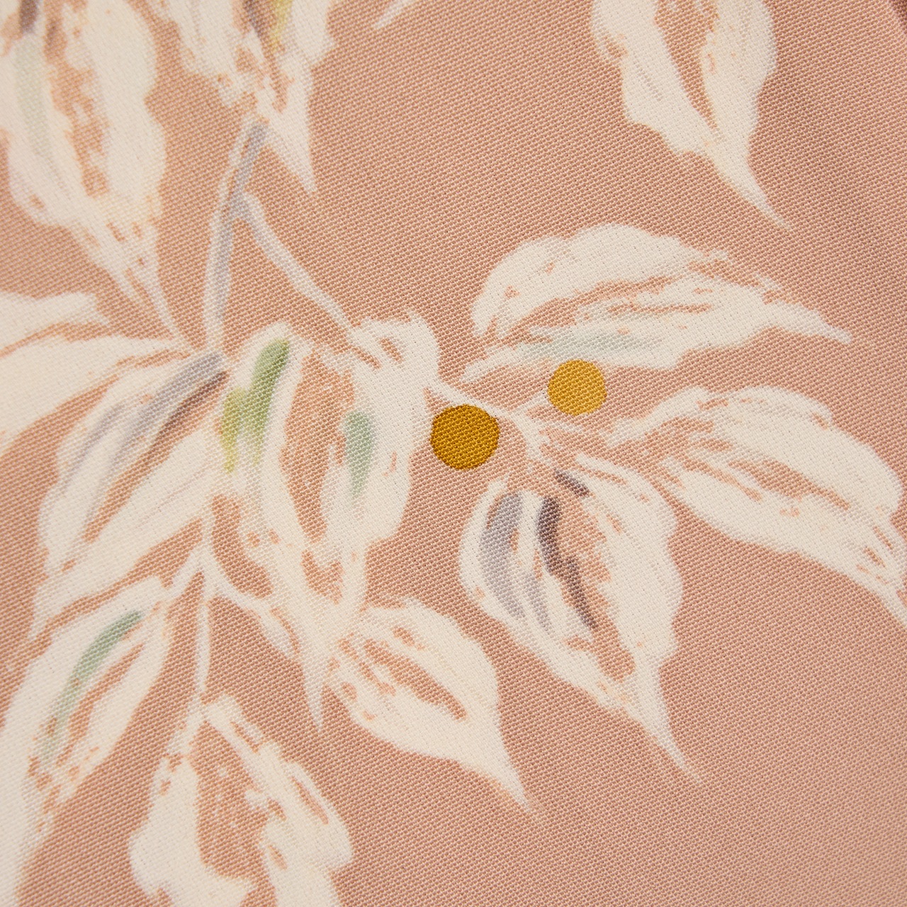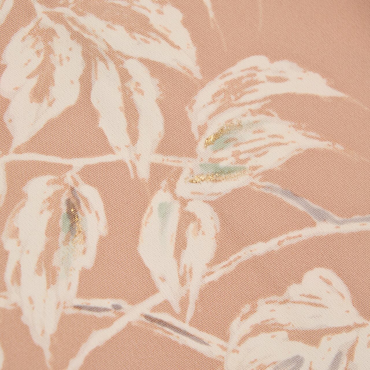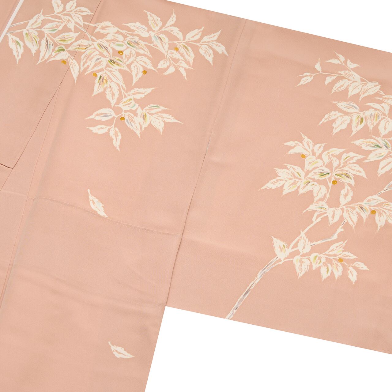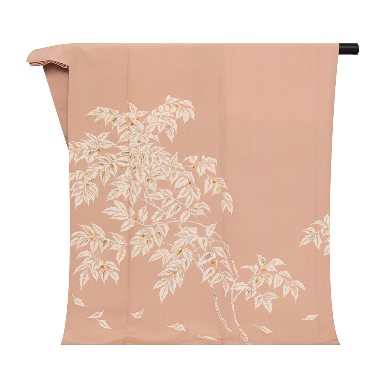 しっかりとした一越ちりめんの生地が、ベージュ味のある淡いピンク・水柿色に染められ、白揚げの友禅で活き活きと茂る木の葉がボリューム感たっぷりに描かれ、そこに小さな実がなっていて、どことなく秋の風情を感じられるような素敵な訪問着のお着物です。