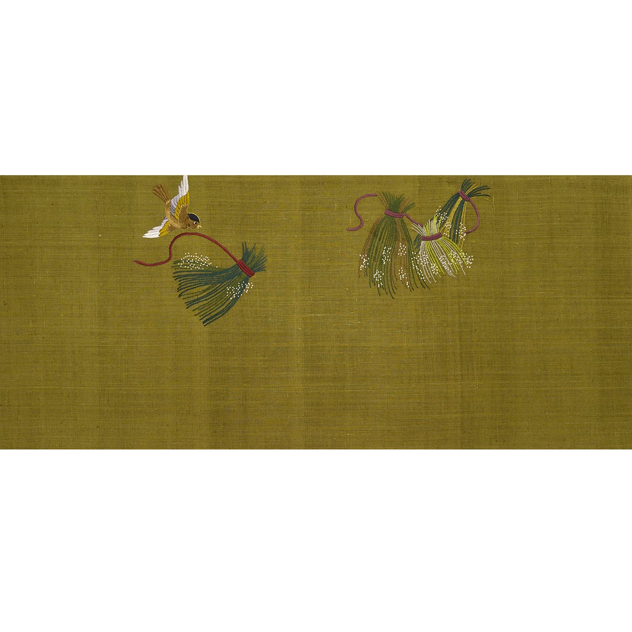 ふんわりとして軽い結城紬のような紬地が、渋めの緑・海松色に染められ、お太鼓には豊かな実りを表したような、たくさんお米が実った稲束が描かれ、お米に縁の深いスズメがそばを飛んでいるといった、秋の田んぼの風景が細やかな手刺繍で見事に描かれた、お洒落な九寸の開名古屋帯です。