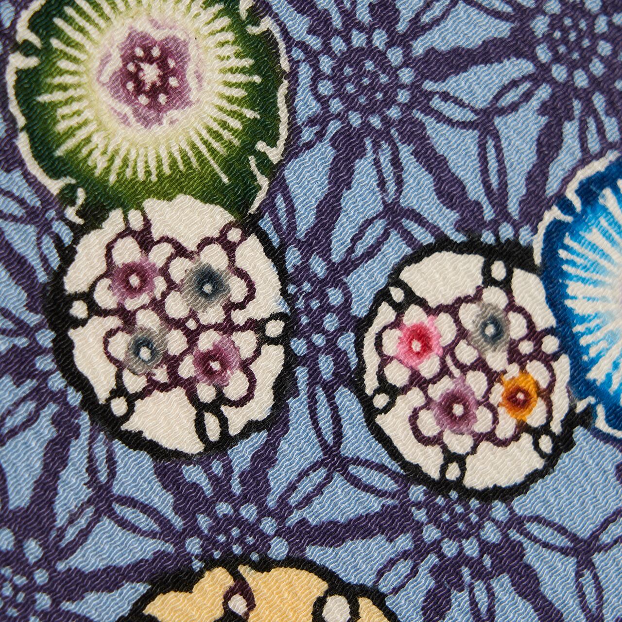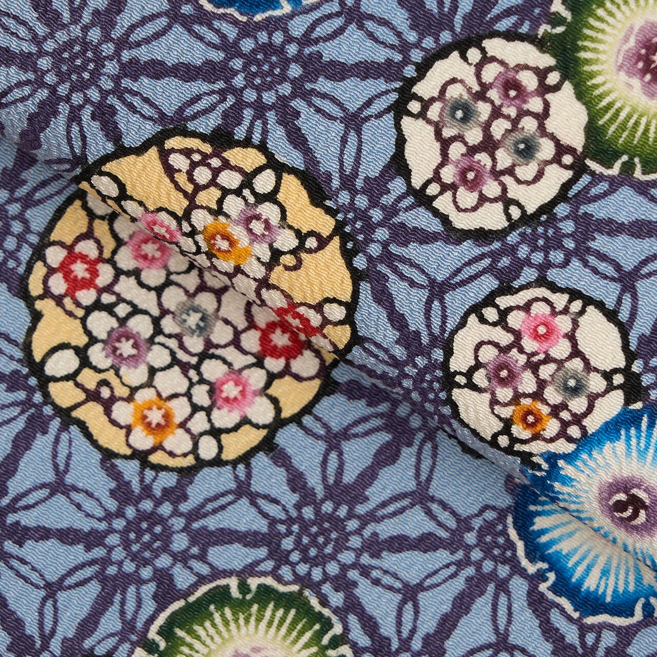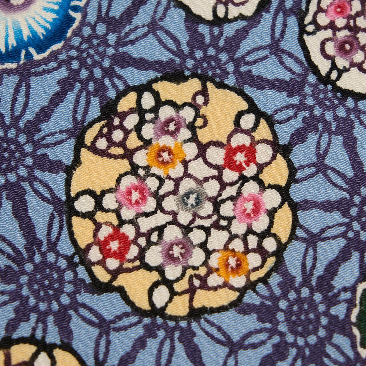 まずお花を抱えた大小の雪輪文と、お花のような形にアレンジされた少し小さい雪輪の文様が、くっきりとした色合いでカラフルに、そして細やかに染められています。
