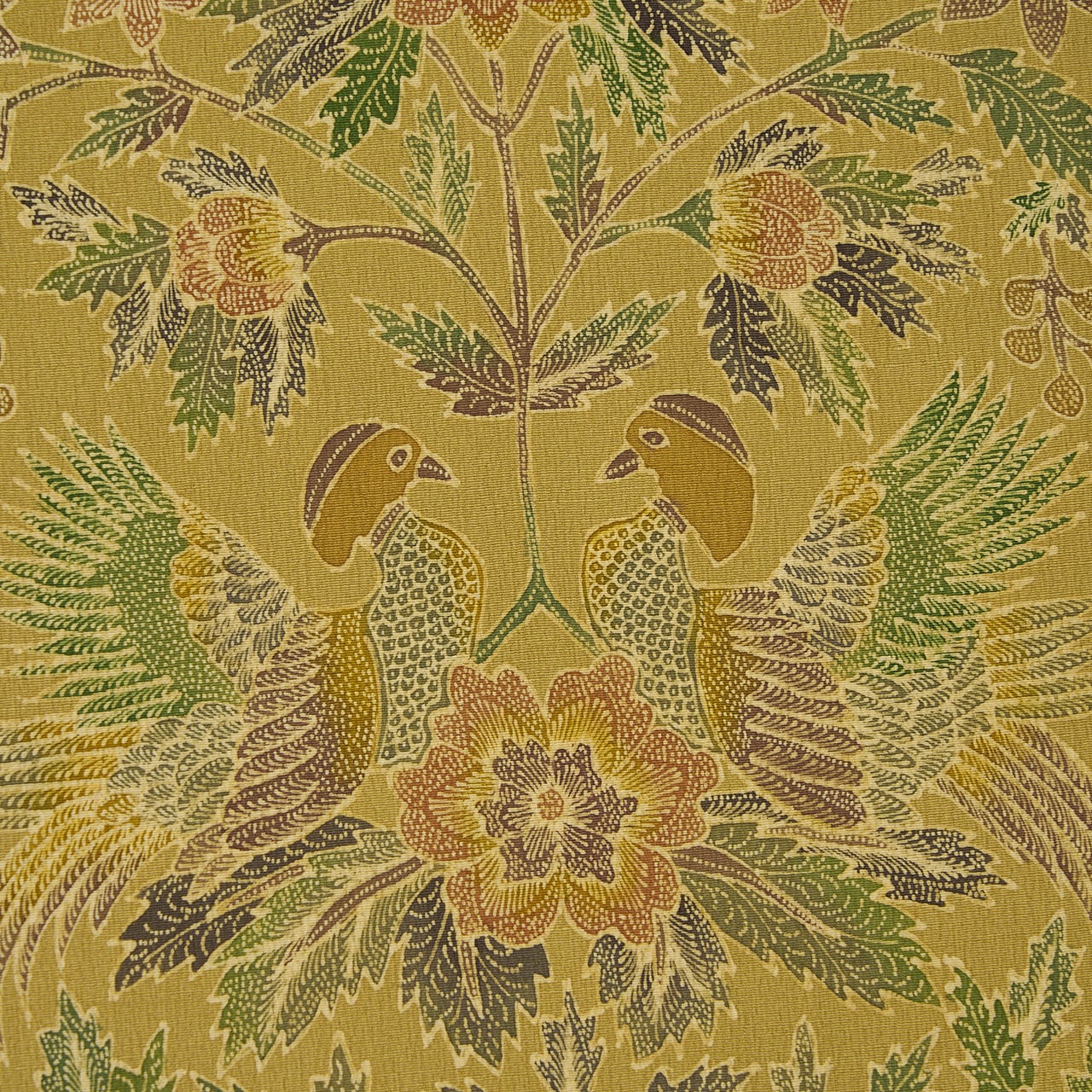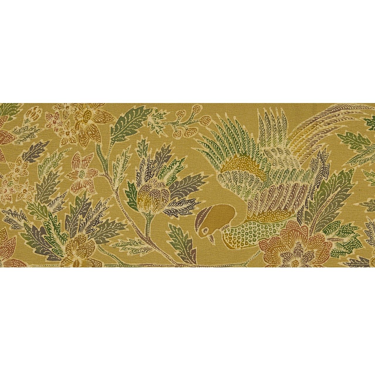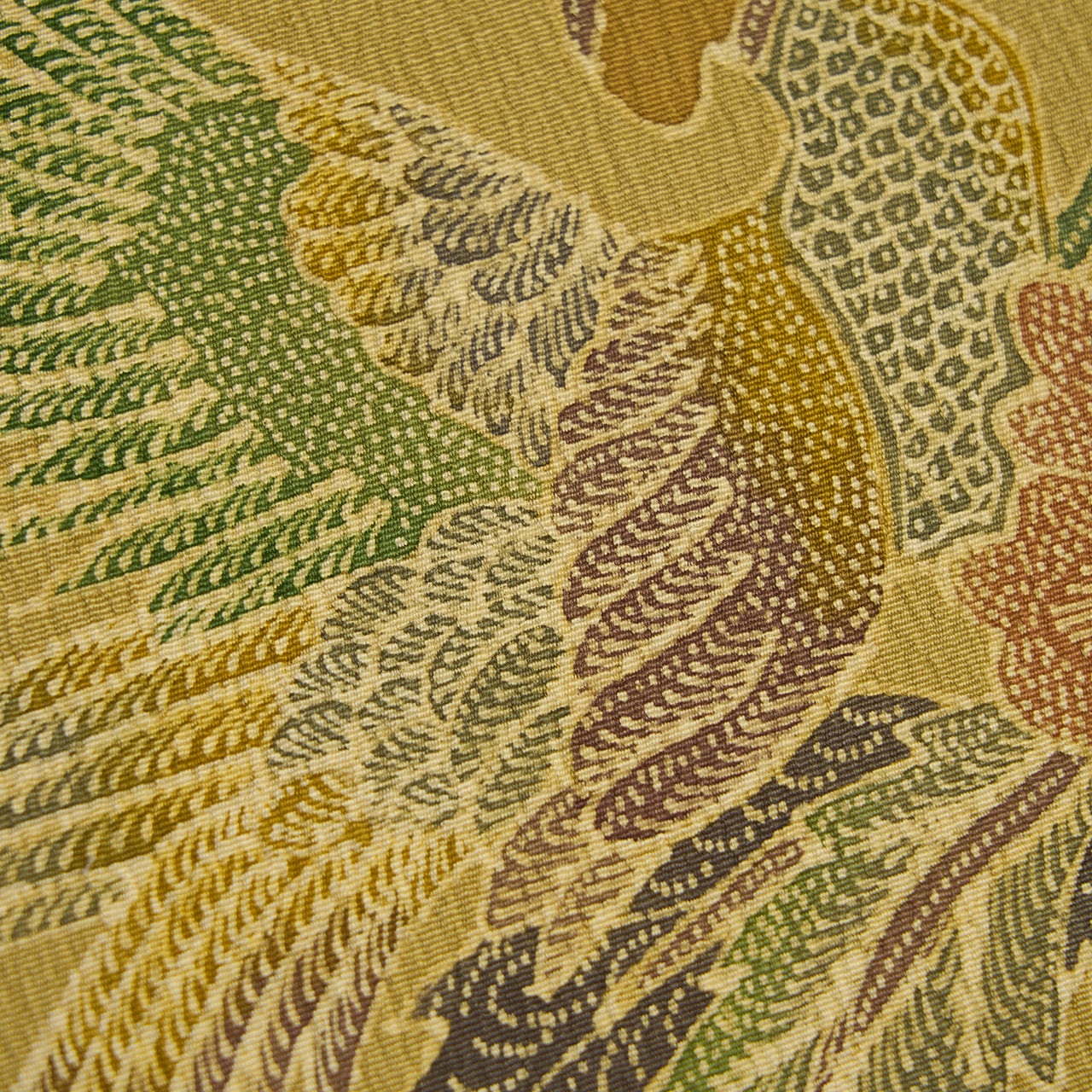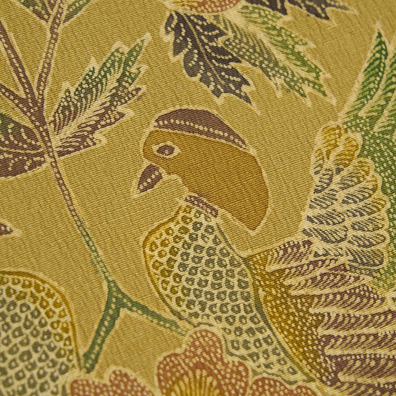 インドネシアの手描きのバティックのように、非常に細かい部分まで蝋纈で描かれていて、鳥のからだや羽の描写、花や葉の葉脈など、見ていても飽きる事のないような手描きの味わいが魅力となった、素晴らしい帯となっています。