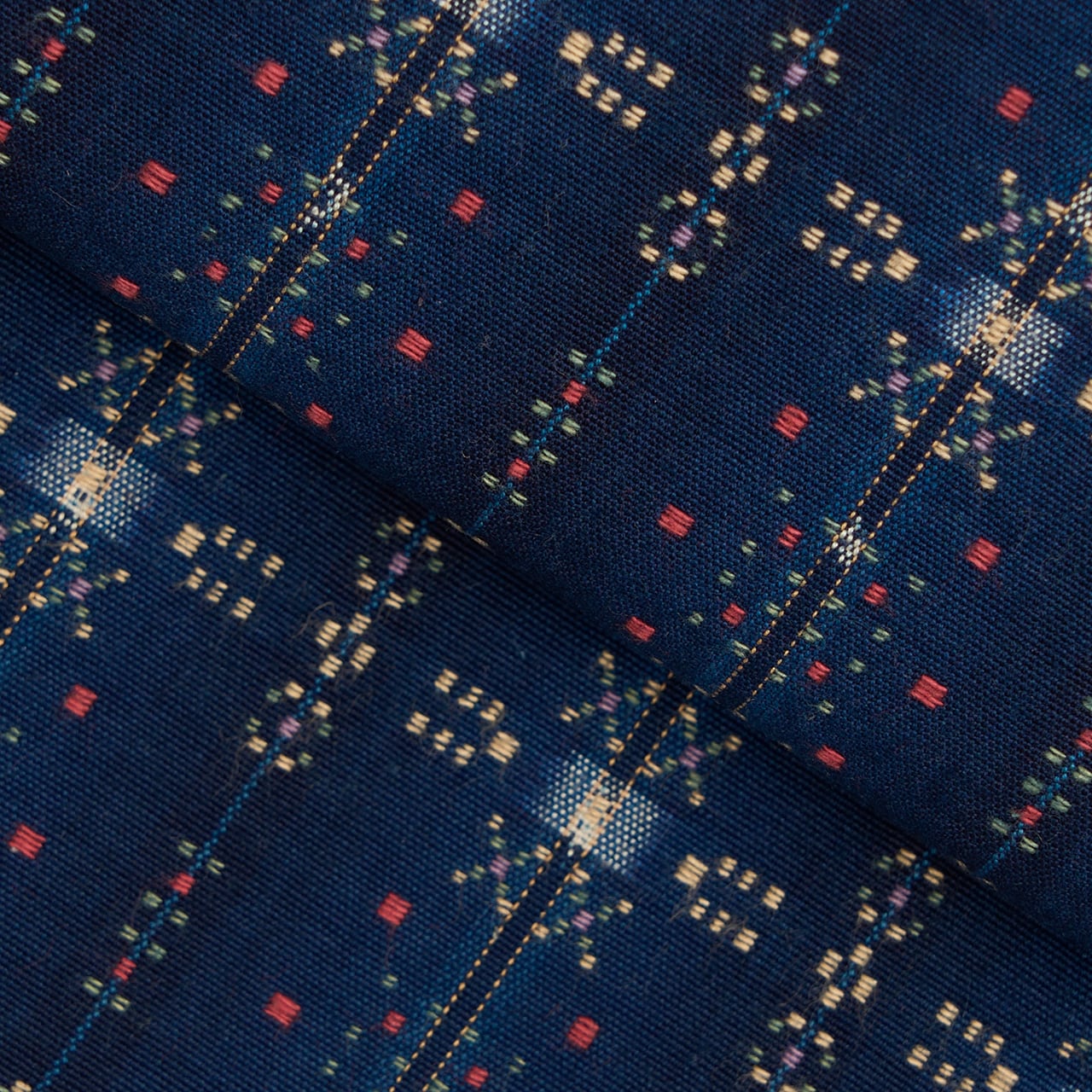 今回ご紹介させていただく作品は、藍染の木綿に縦に6本の縞が走り、そしてそれに絣の緯糸が絡んで、それを中心にして様々な形の花織が咲き乱れるように散らされた、鳥巣さんの高い織りの技術を集約されたような「籬(まがき)の薔薇」という作品です。