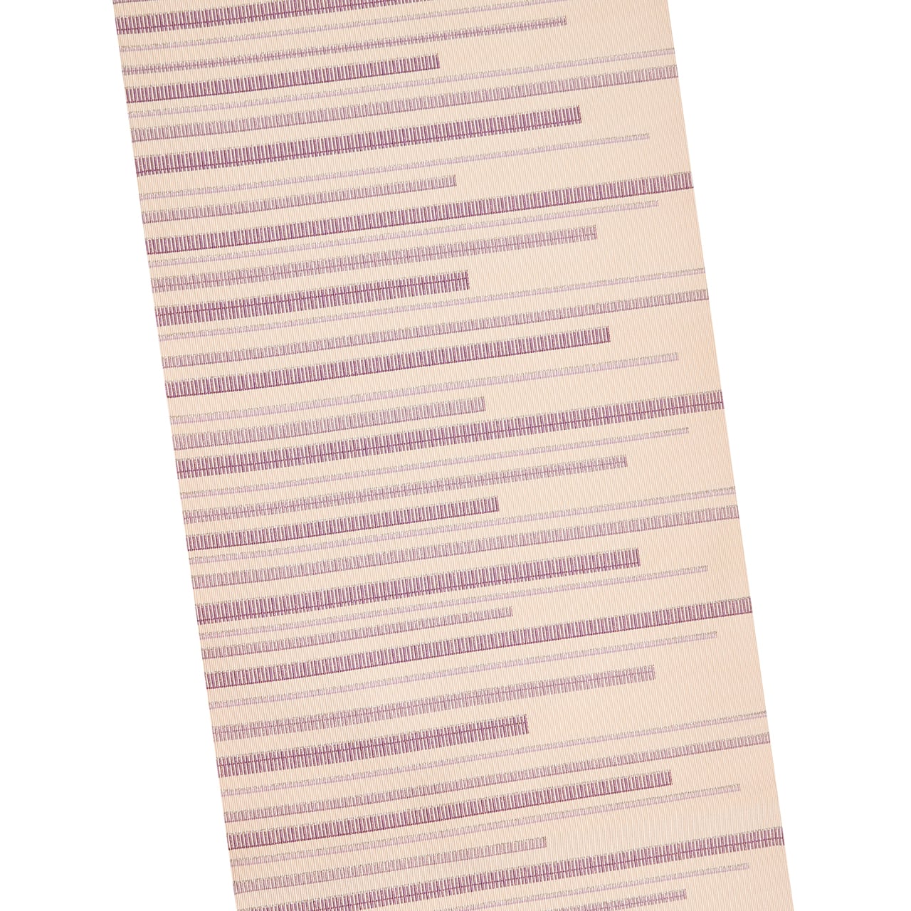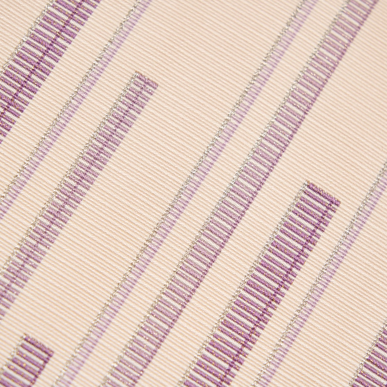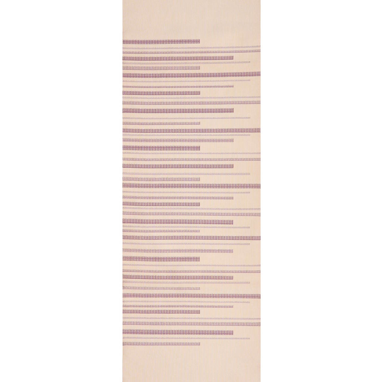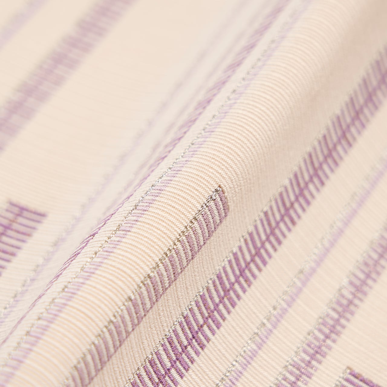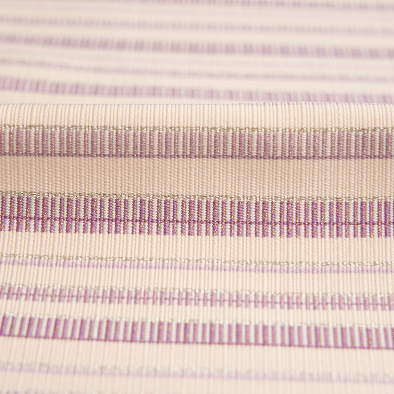 象牙色の地には少し細い縦縞のような模様が織り出され、お太鼓の部分には葡萄色の紫と、それよりやや薄い鳩羽色と銀糸で、縦の縞の綴れ織で構成された段のような横縞が端正に織り出されていて、ぶれる事のない程よい緊張感のある、とてもすっきりとした素晴らしい帯となっています。