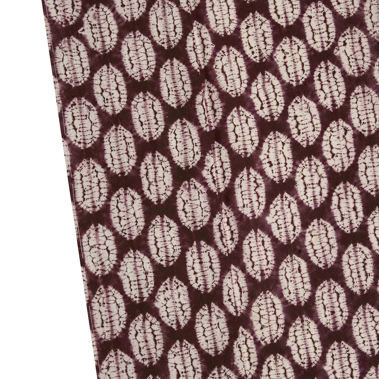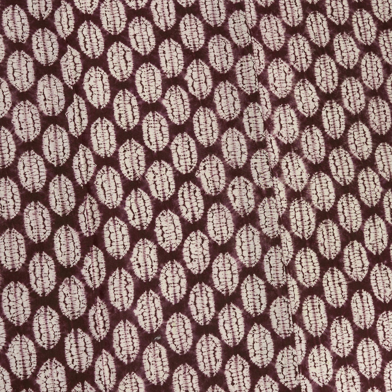 横が約3cm、縦が約5cmの大きさの長い丸の模様が縫い絞りされたものを、さらに屏風だたみにして板締め絞りのような技法で染められているようです。