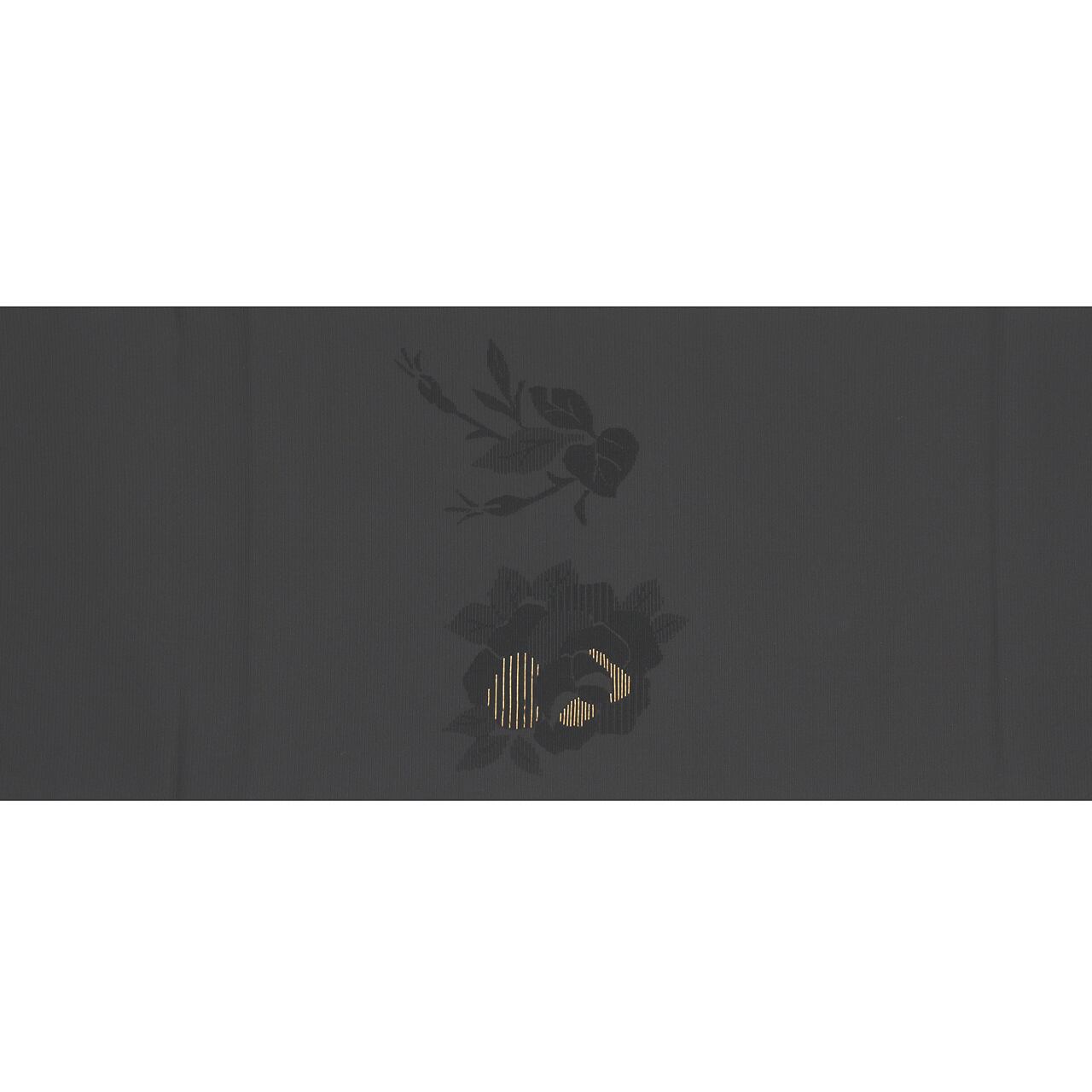 非常に細かい横縞のような地模様の光沢のある黒の生地に、お太鼓には大きな薔薇のお花が、同じく黒の切ビロードと金の箔の糸で織り出され、中心には相良刺繍が施された、とてもお洒落でゴージャスな九寸の開名古屋帯です。