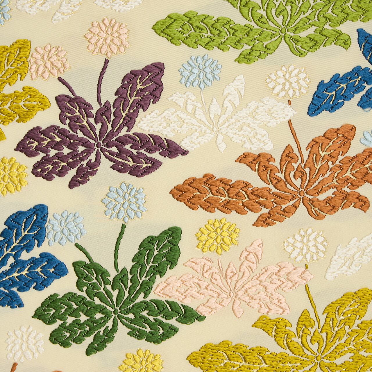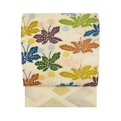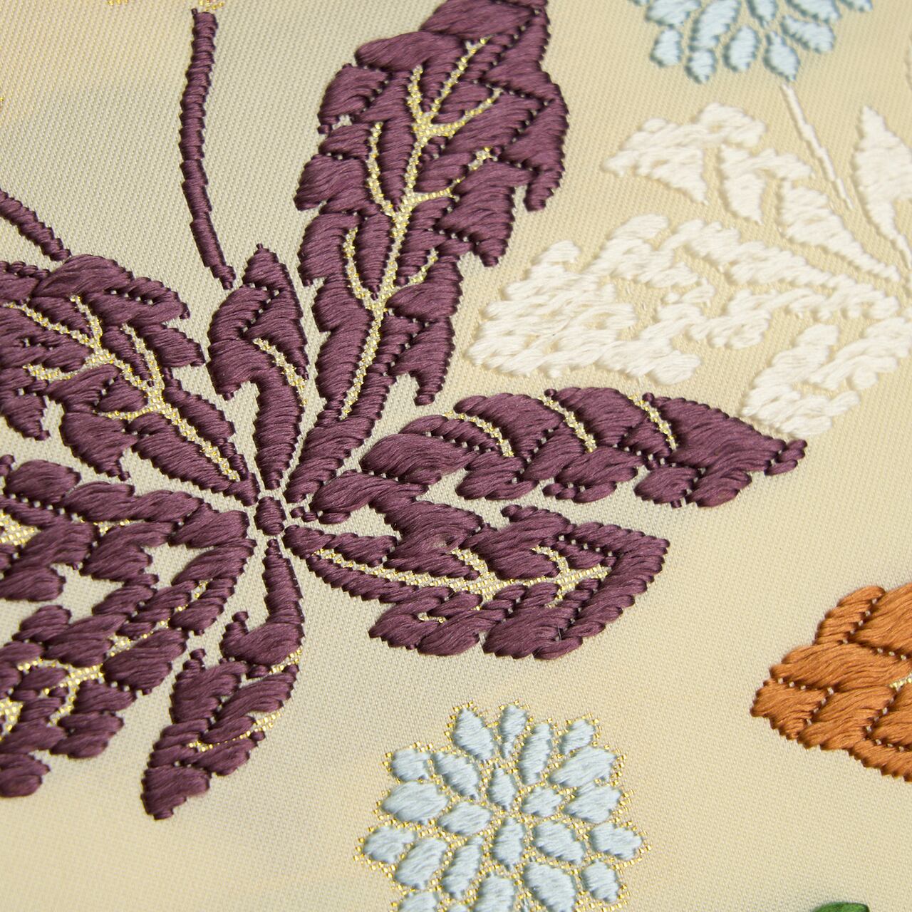 シャリっとした極細の糸でしっかりと織られた練色の地に、段替わりに入子菱文と、滅紫色や紅鳶色、青丹色など色とりどりの蒲公英の文様が唐織で織り出された、紋意匠鈴木さんの素敵な袋帯です。