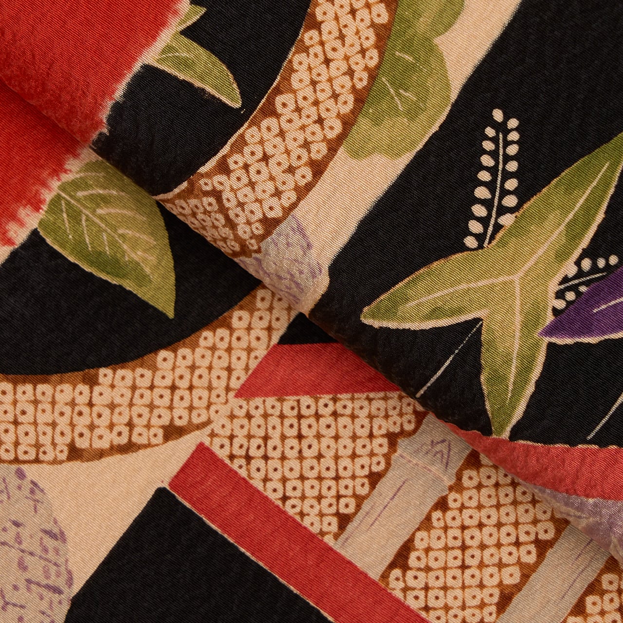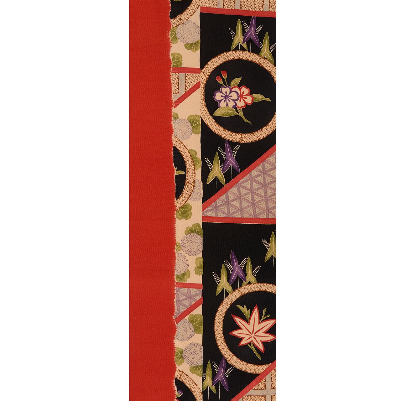 縦にシボのあるさらっとした質感の多ち花さんのオリジナルの生地が、左側の10cmくらいに朱・緋色の絞りで染め分けられ、真ん中の5cmほどが白茶色に染められて、右半分は黒の地に竹垣のようなものが三角と丸で取られた中に、細かな疋田模様が描かれたものと、麻の葉模様が描かれたものがあり、そこにオモダカやアジサイ、桜などの草花が描かれた、古典の良さが現代的な色使いで表されたような、お洒落な九寸名古屋帯です。