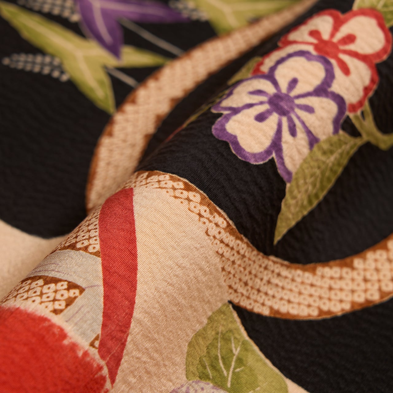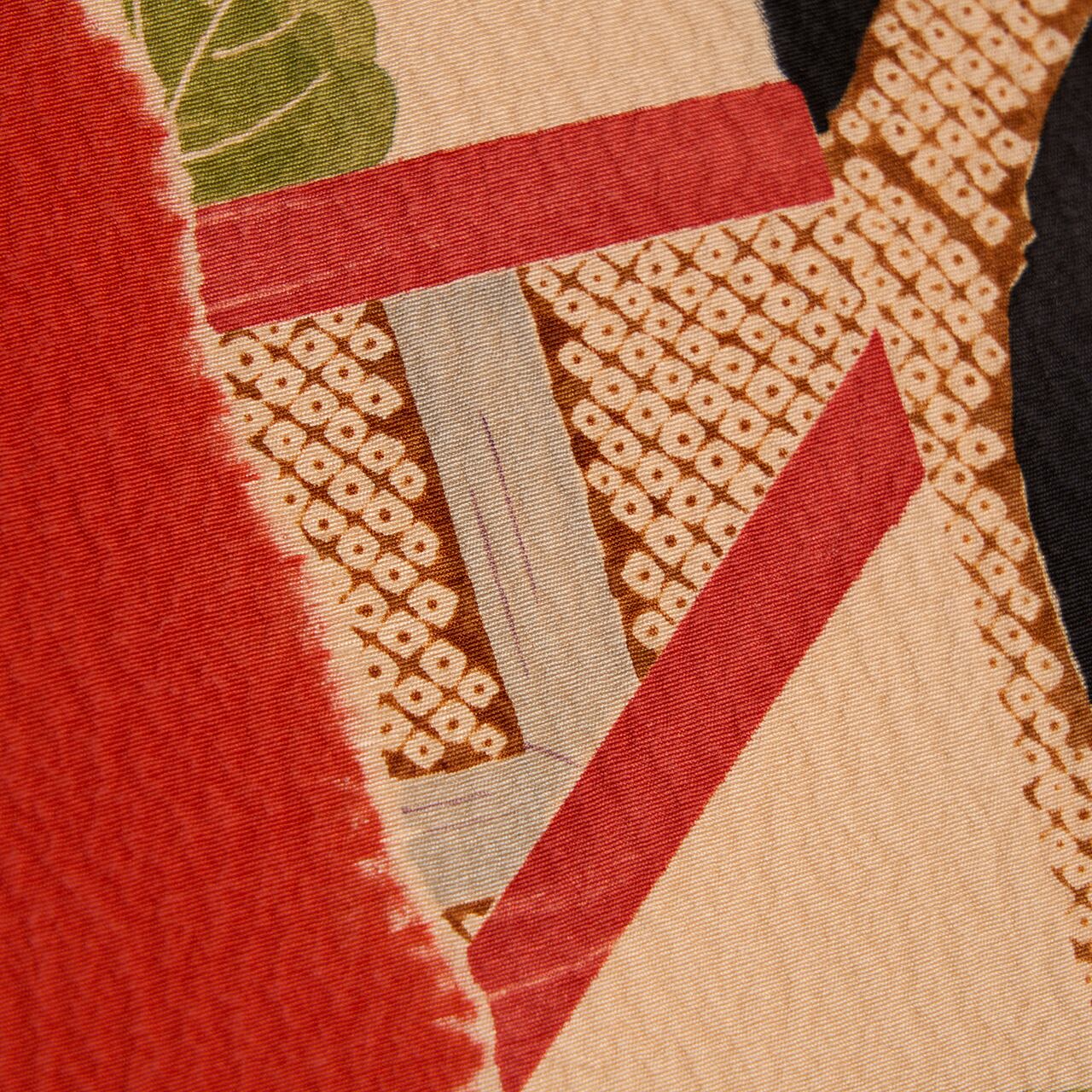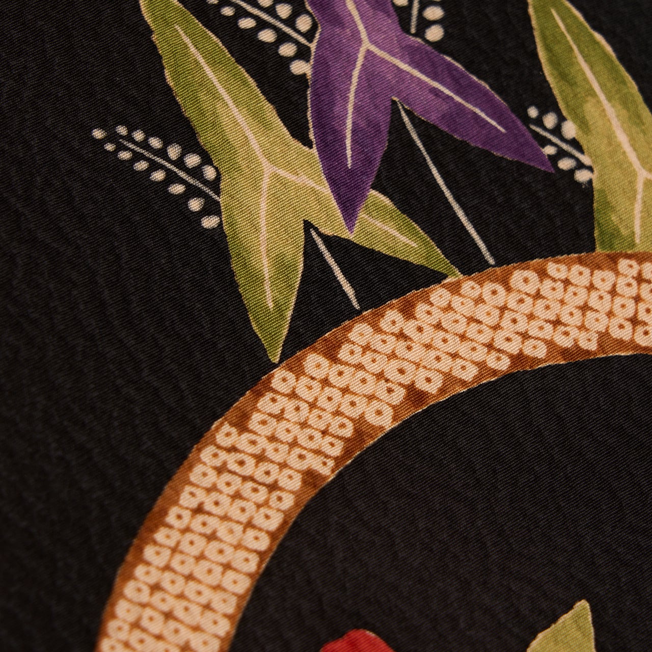 竹の輪や垣根などに細かな疋田模様が染められているところや、オモダカやアジサイなどの佇まいなどにもクラシックな雰囲気が感じられますが、地染めの大胆な染め分けや丸と三角のデザインの面白さなどに、どこかモダンな要素も加味されていて、多ち花さんらしい個性とお洒落さが感じられます。