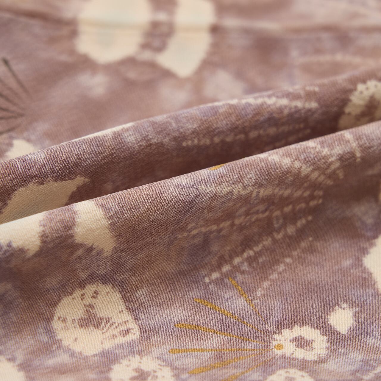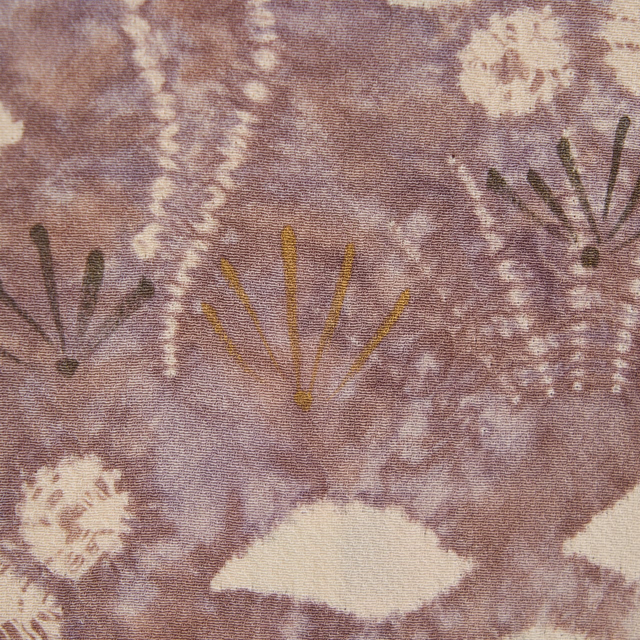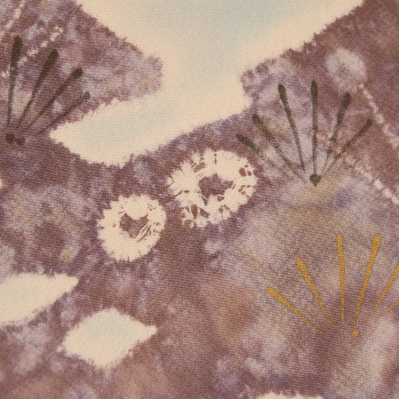 松の葉の揺らぐような濃淡の染めの絶妙な表現と、ところどころに絞りで線と丸い形が入れられている事で、松の木に生命が吹き込まれたように活き活きとしたものとなっているところなどを拝見しますと、全体の構図といい、優れたデザインを実際に形にされる力をお持ちだったのだと改めて感じさせられました。