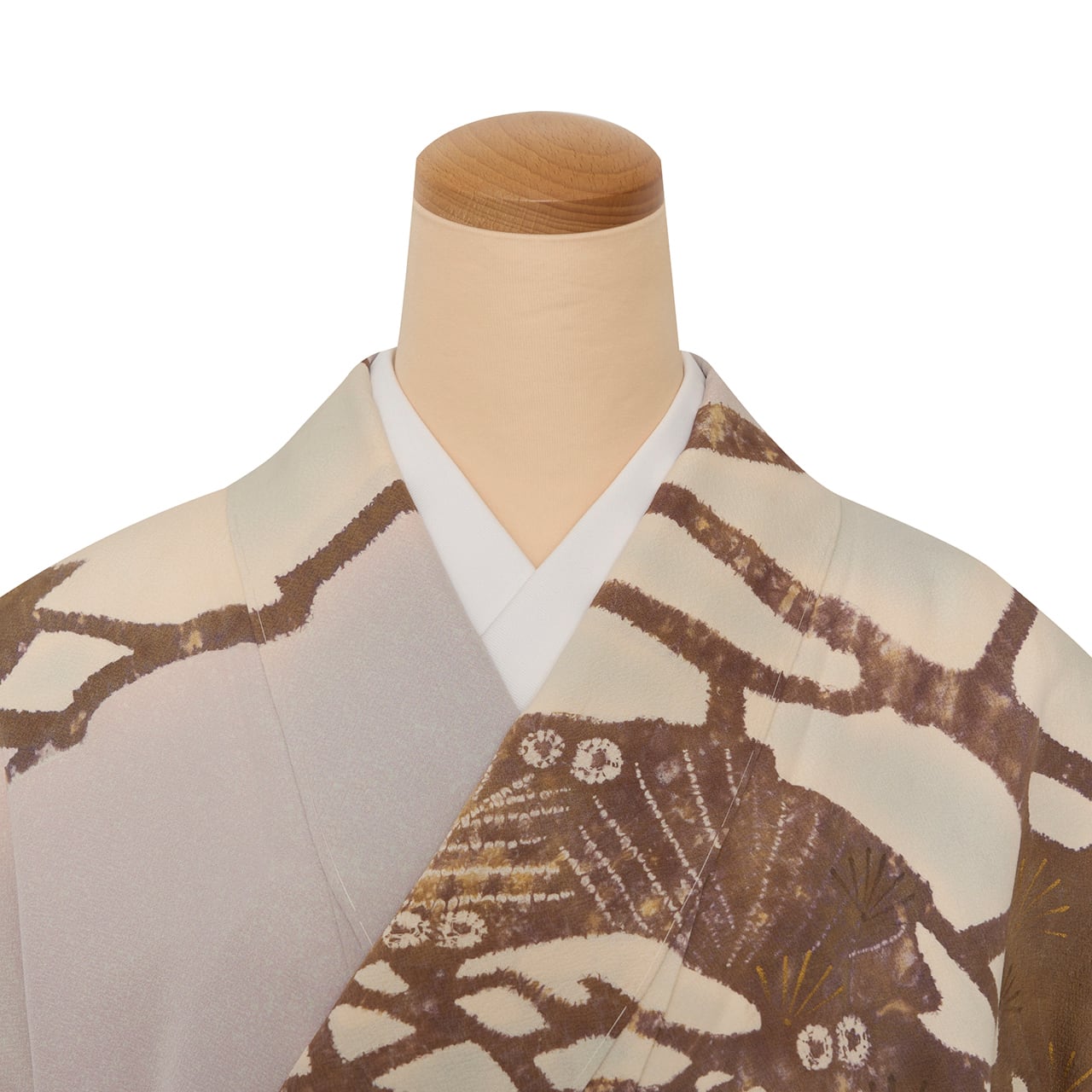 淡いグレー味のある薄紫・薄梅鼠色に染められた一越ちりめんの生地に、大胆な構図で枝を広げる松の模様が、紫鼠色から鳩羽鼠色の濃淡の絞りと友禅で表され、松の部分には淡い水色・白藍色が暈しで挿された、躍動感のある素晴らしい訪問着のお着物です。