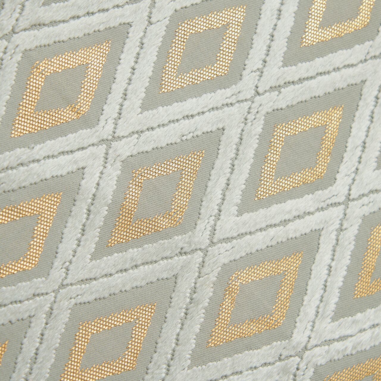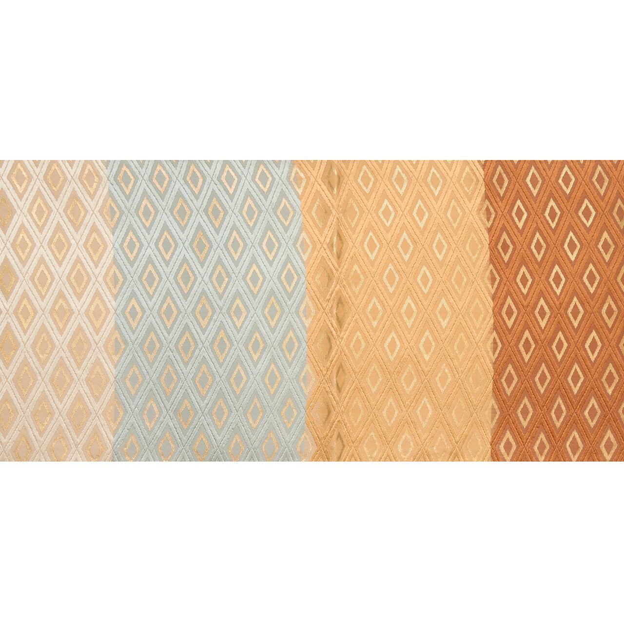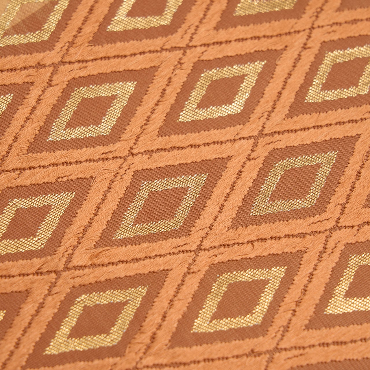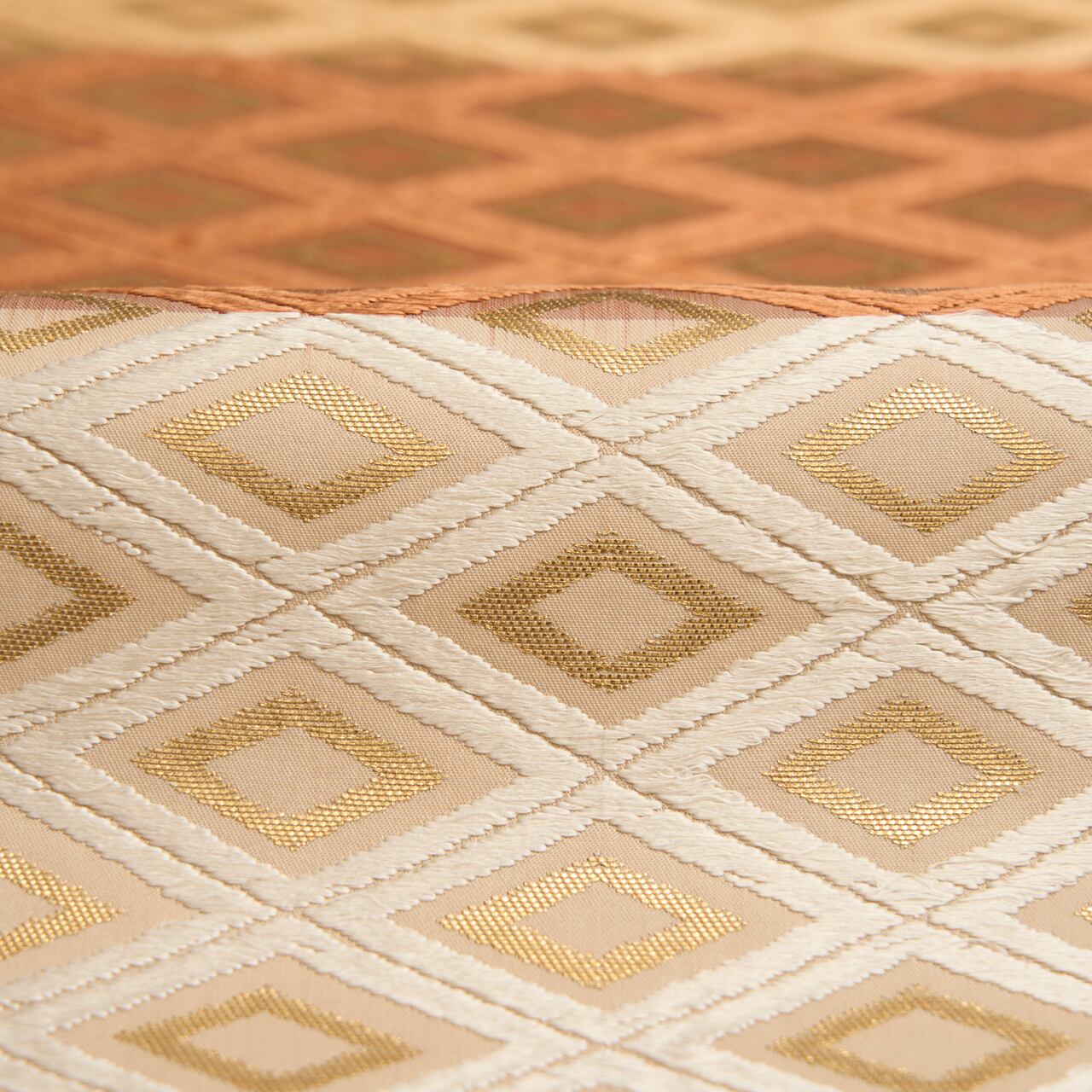 こちらは重要無形文化財「有職織物」の技術保持者である喜多川俵二さんの、斜め格子に菱の文様が段変わりの色で織り出された袋帯の作品です。