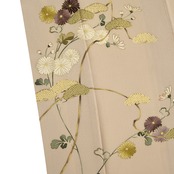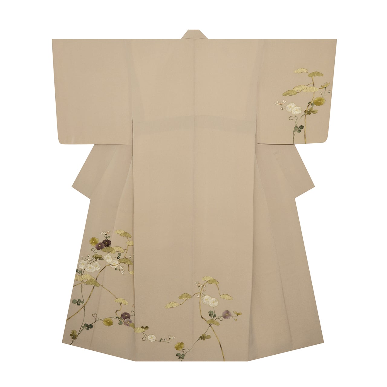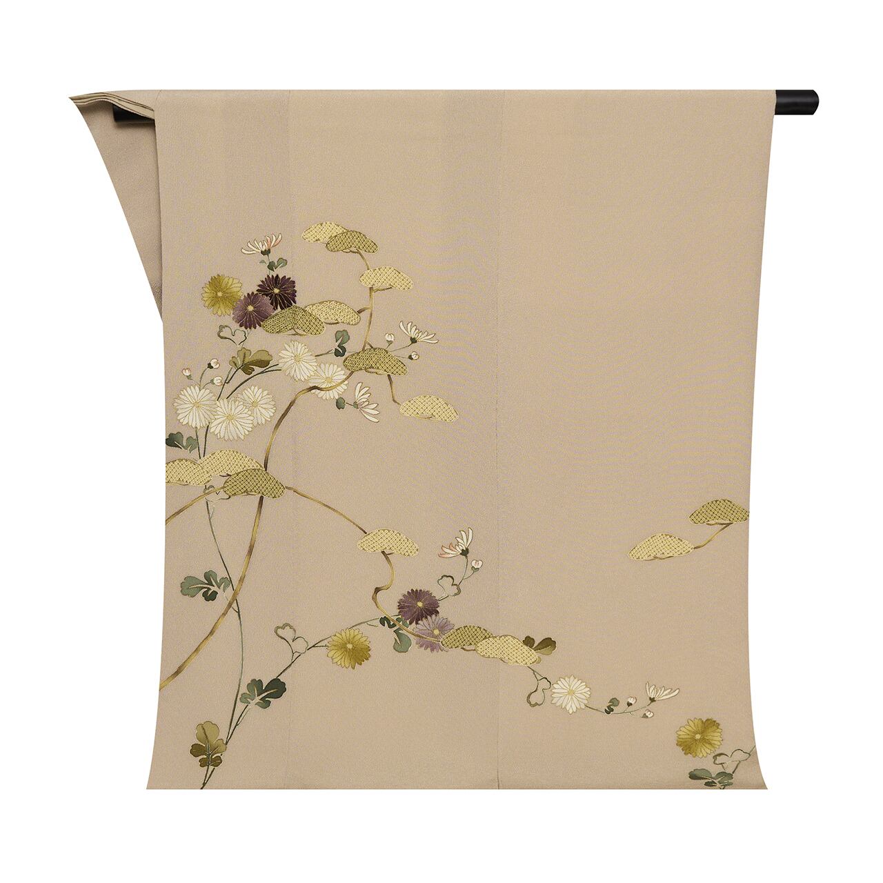 グレー味のあるシックなベージュ・白橡色のちりめんの生地に、上前には葉を茂らせた松の枝が、遠くに浮かんでいる雲のように描かれて、中は細かな疋田模様でうめられ、それに絡むように枝を伸ばす菊のお花が濃色の濃い紫や薄色の淡い藤色、榛色の金茶、そして白といった調子に全体的にも抑えたトーンでまとめられた、とてもお洒落な訪問着のお着物です。