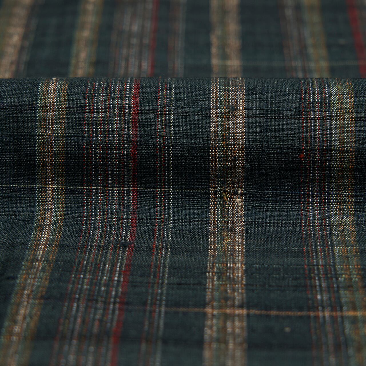 こちらは藍味のある緑・高麗納戸の地に、草木で染められた5色の糸がランダムに並べられ、絶妙な色のハーモニーを奏でているような、素敵な模様が構成されて織り出されています。