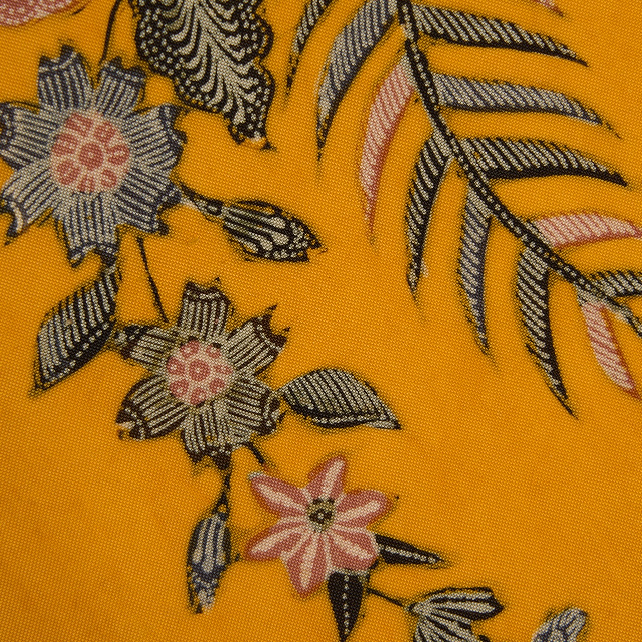 籠の細かい網目や花びらや葉脈などに、手描きの蝋纈の線や点が描き込まれていて、高級感の漂うバティック模様となっています。