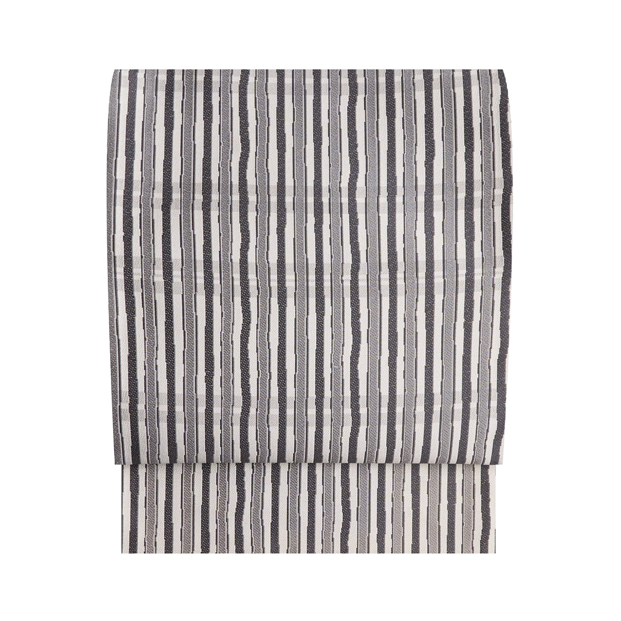 生成り色のしっとりとした質感の地に、鈍色の濃い目のグレーと、藍墨茶色のよろけ縞が手描きの線のように織り出された、モノトーンの雰囲気がとてもお洒落な袋帯です。