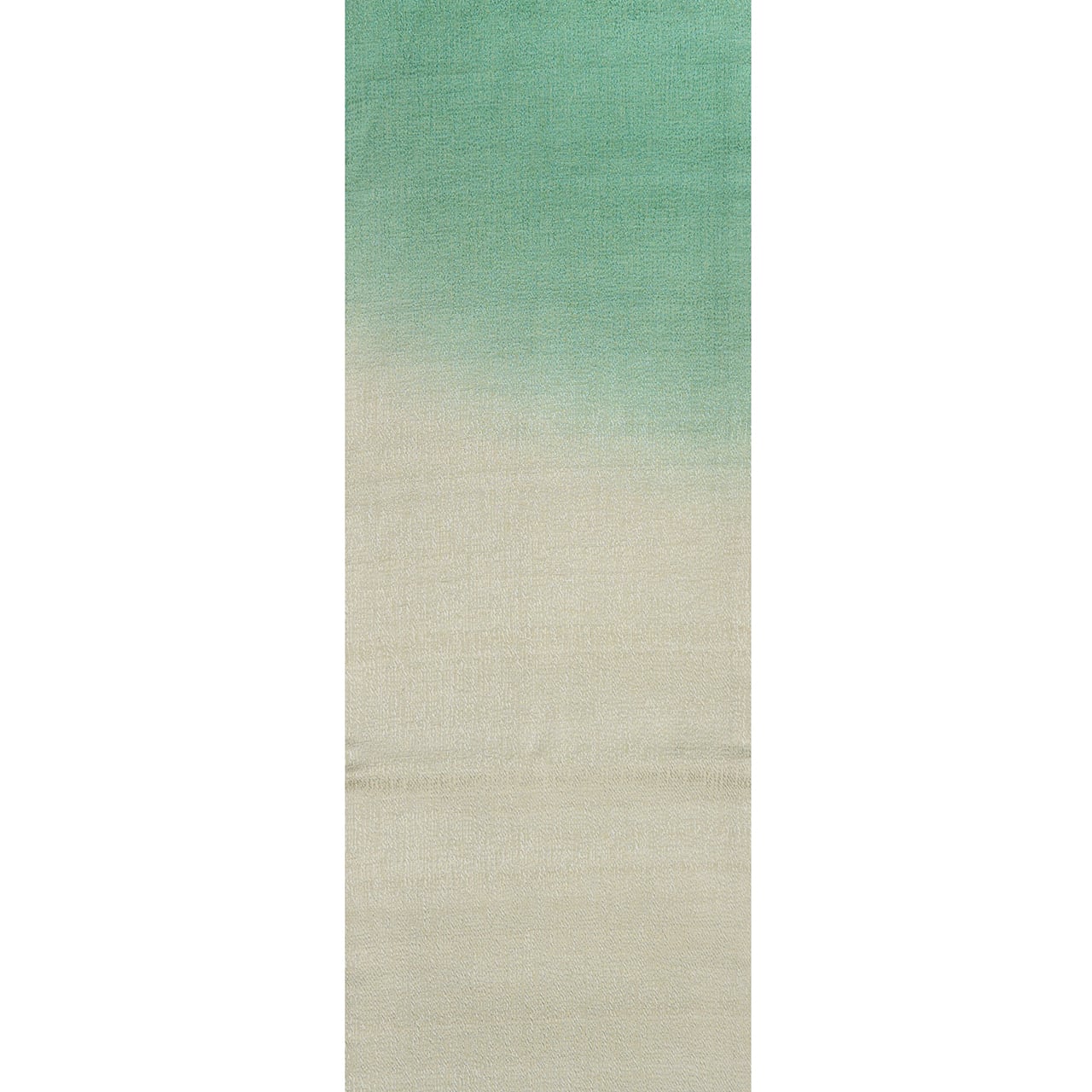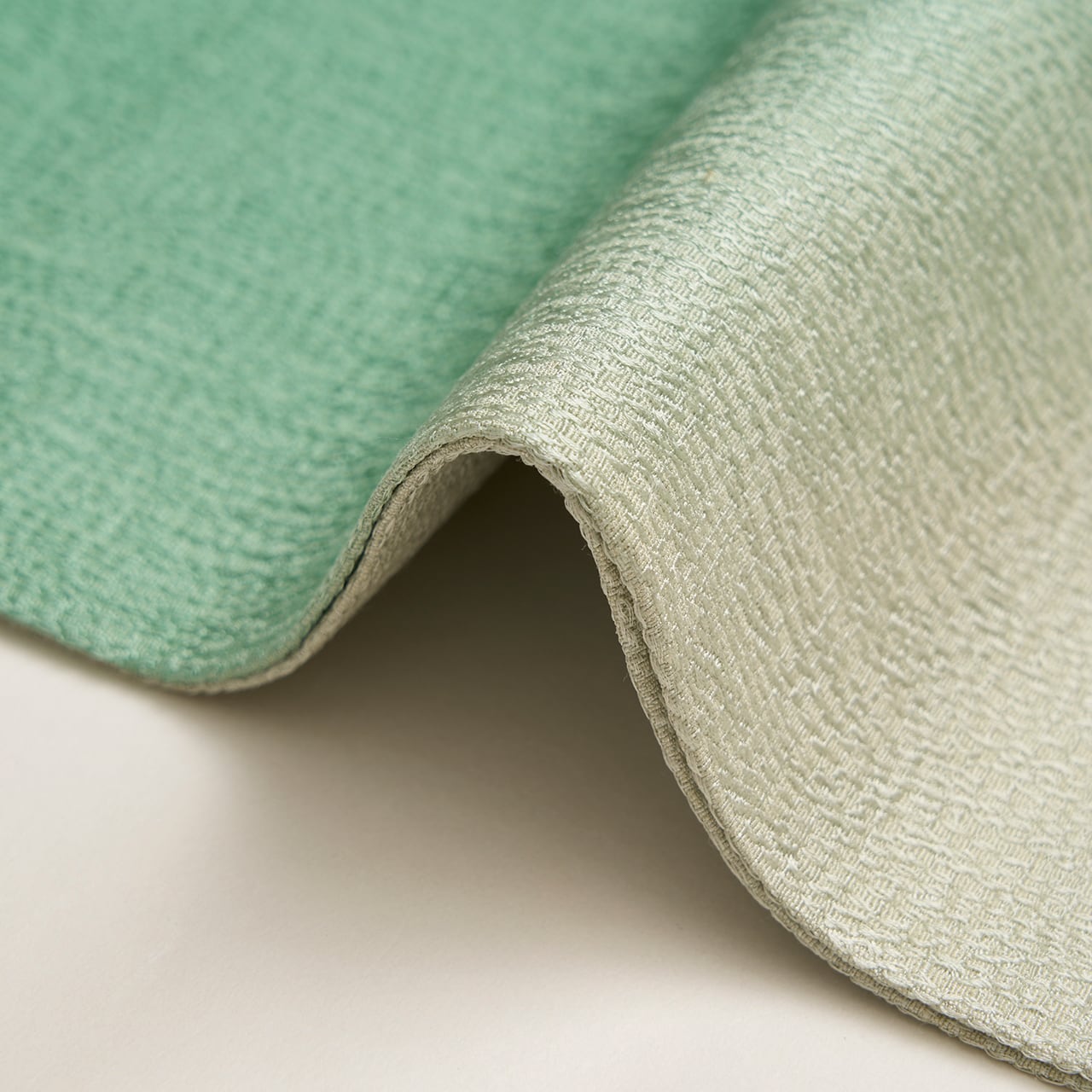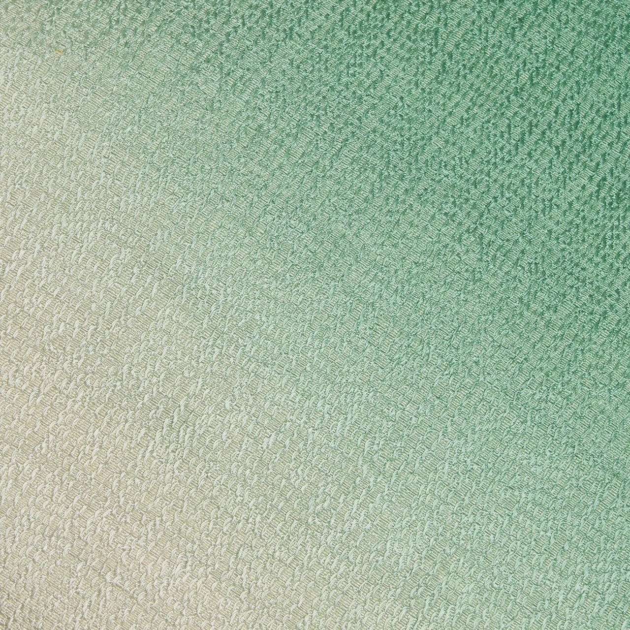 山繭ならではの透明感のある青磁色を淡くしたような白緑色の糸が、少し浮き織のような変わり織にされ、お太鼓と前柄になる部分だけ、同系色の濃く明るい緑・花緑青に吊り暈し染めをされた、とてもお洒落な雰囲気の九寸名古屋帯です。