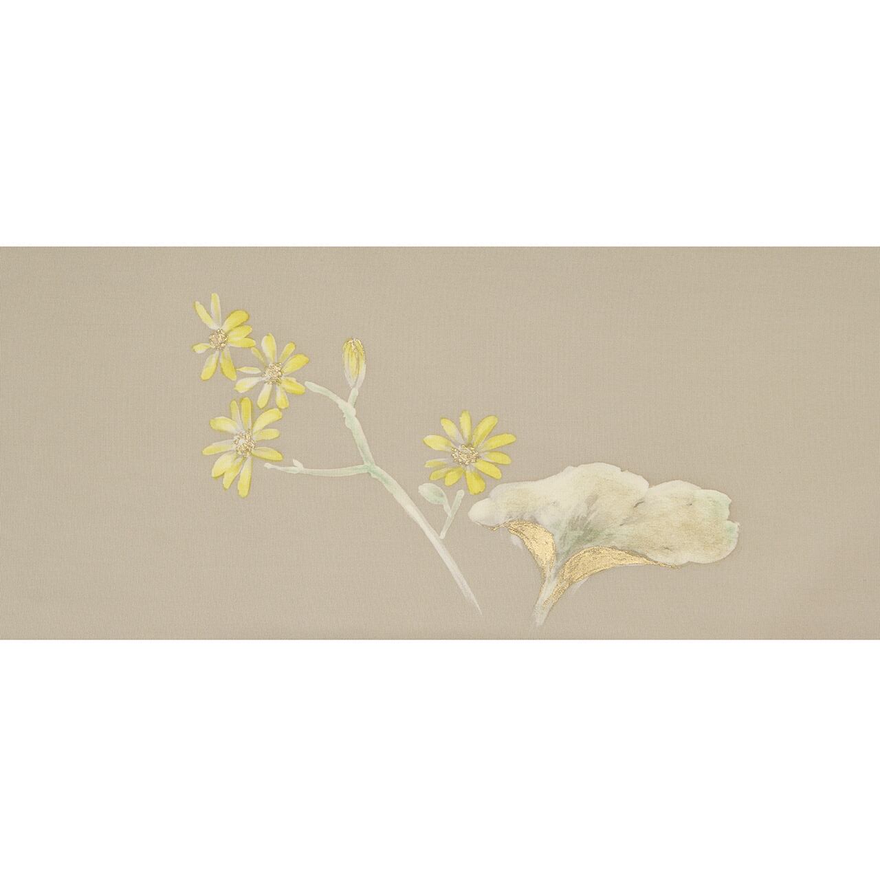 綺麗なグレーベージュ・潤色のしなやかな塩瀬の生地に、お太鼓には楚々としたツワブキのお花が可憐に咲く様子が手描きの友禅でしっとりと描かれた、とてもお洒落な九寸名古屋帯です。