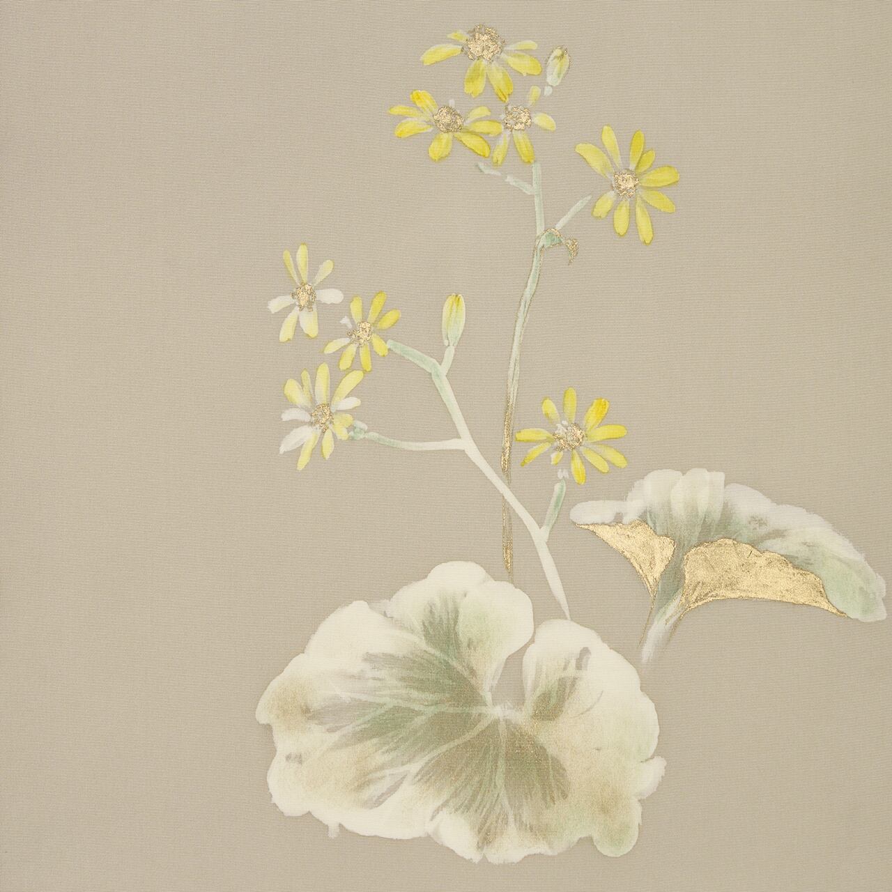 初冬から冬の季語に使われるツワブキの花は、これからの季節に海辺の近くや野山の木陰、また町なかでも目にする事がありますが、何気ない佇まいにも季節を彩る要素があり、目にすると可愛くて嬉しくなってしまいますし、染織品のモチーフとしても好んで使われています。