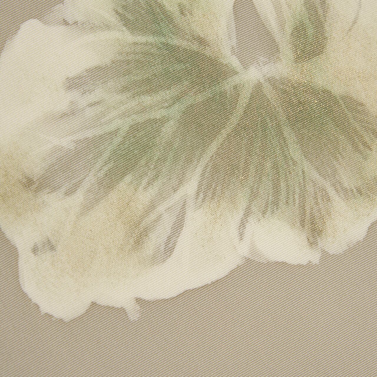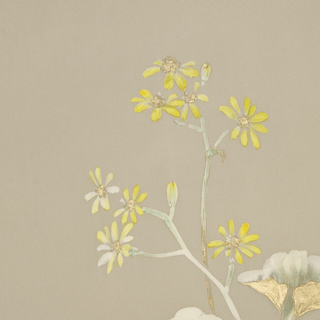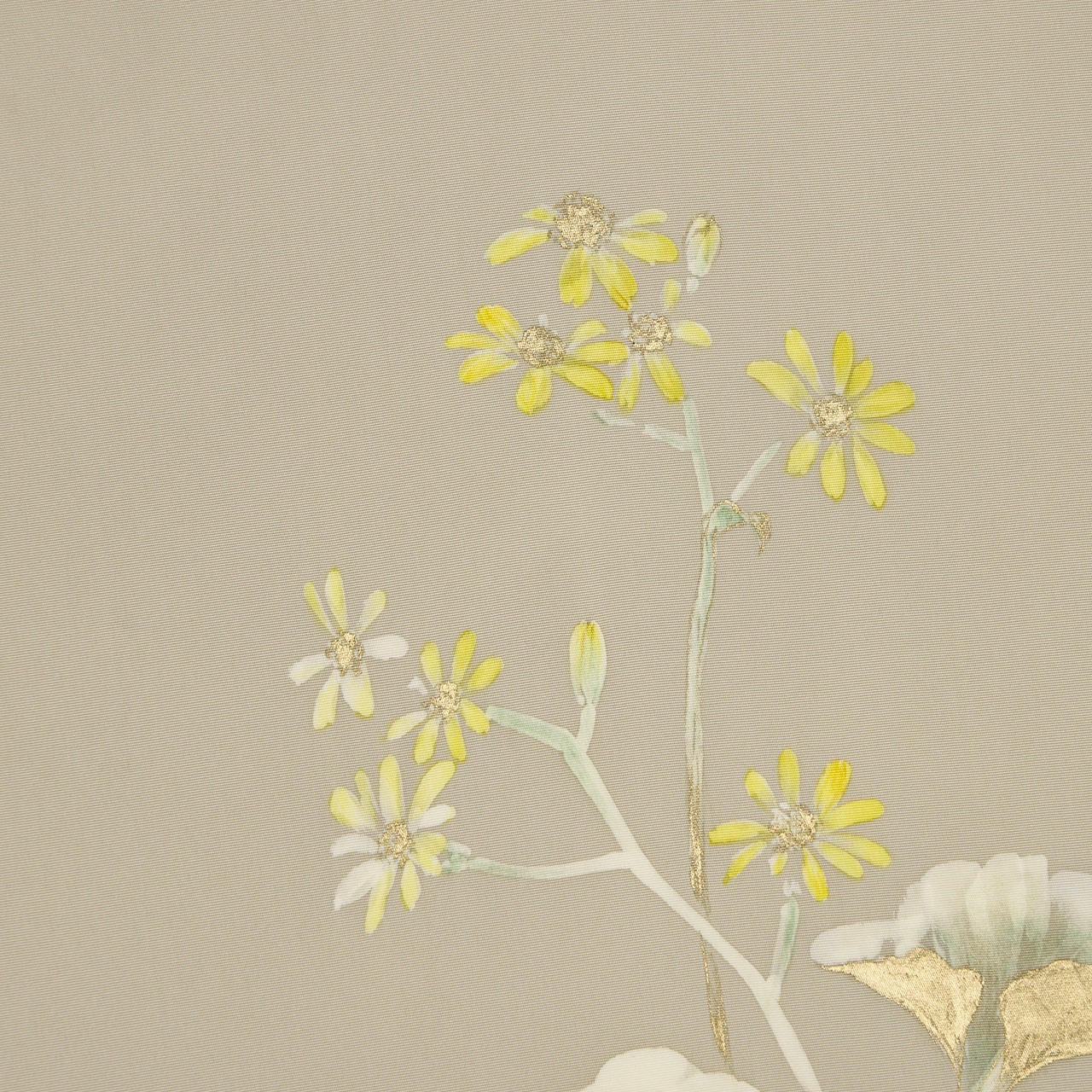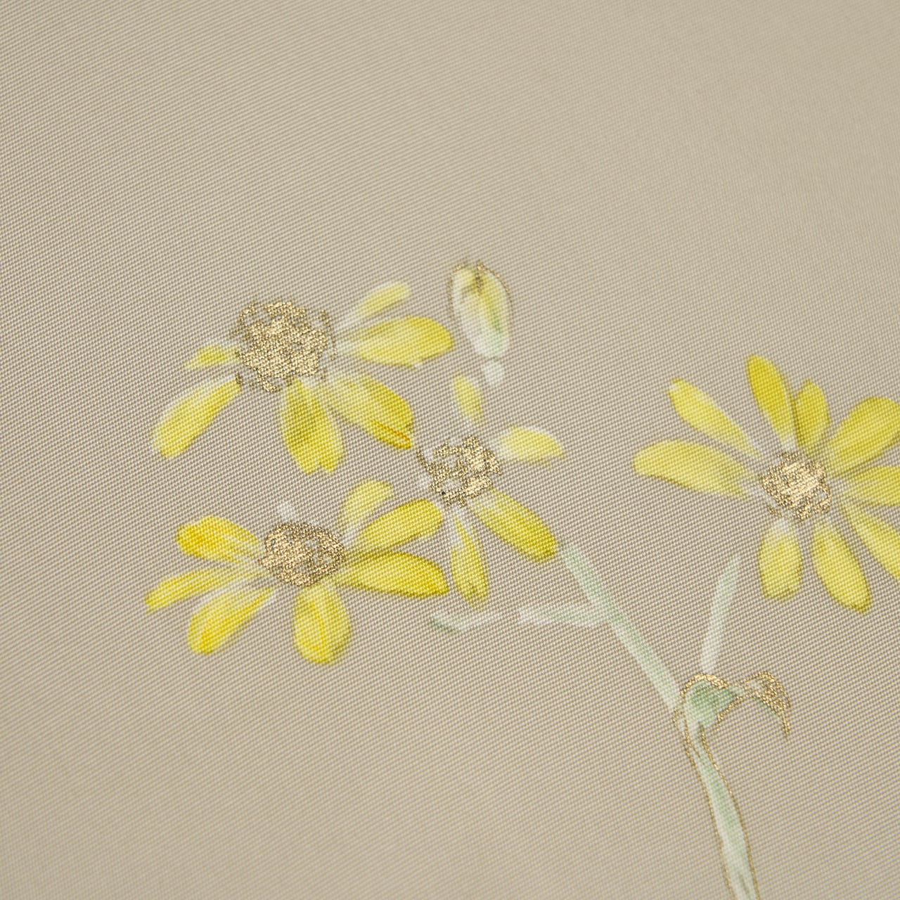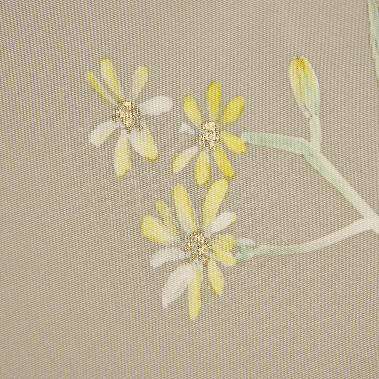 野に咲くお花をスケッチしたような写実的な雰囲気が友禅で細やかに表され、葉の裏側には金彩も施されていて、シンプルな中にも丁寧なお仕事ぶりが伺えます。