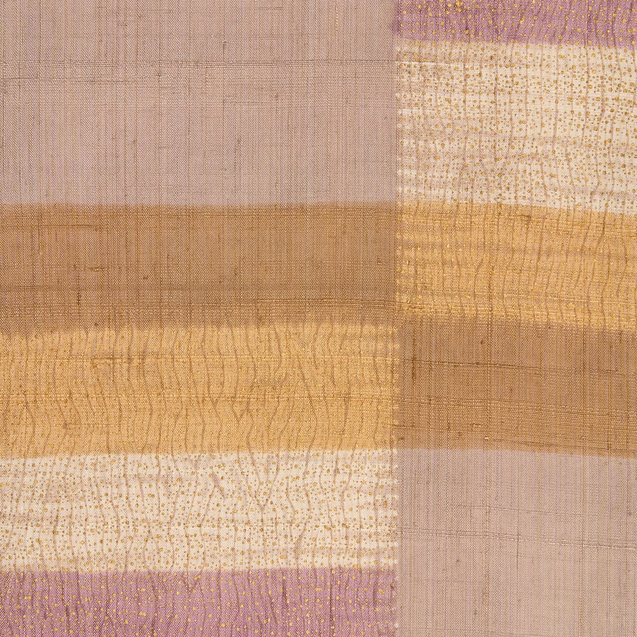 柳絞りのニュアンスのある縦縞に手仕事による味わいが表れていて、その素朴さとシャープなラインでの彩色、さらにそこに施された金彩と、全部がミックスされてバランスの取れたお洒落さがあります。