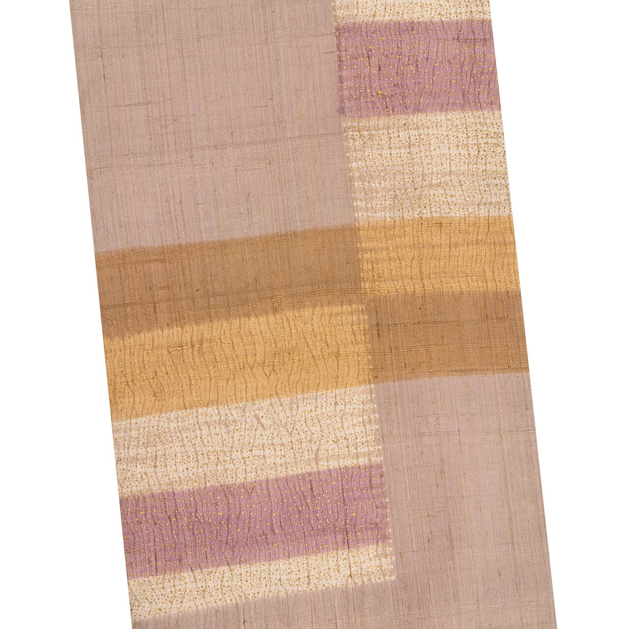 横にざっくりとした節のある座繰りの少し光沢のある亜麻色の紬地が、お太鼓には大きく市松の四角の柄が絞り染めで染め分けられ、その中は柳絞りの縫い絞りが施され、さらにそれに桑染の薄茶と鳩羽鼠色の薄紫が段になるように染められて、模様のところ全体には大小の霰のように水玉の金彩が散らされた、凝った加工の素敵な九寸名古屋帯です。