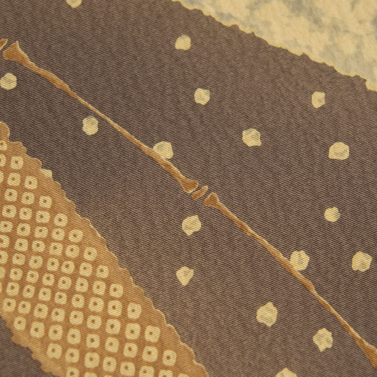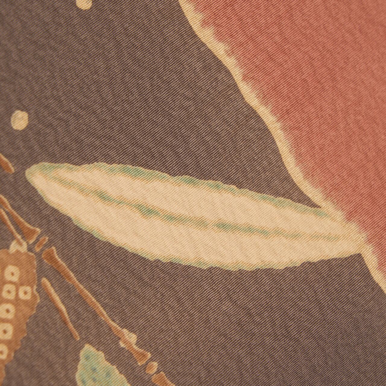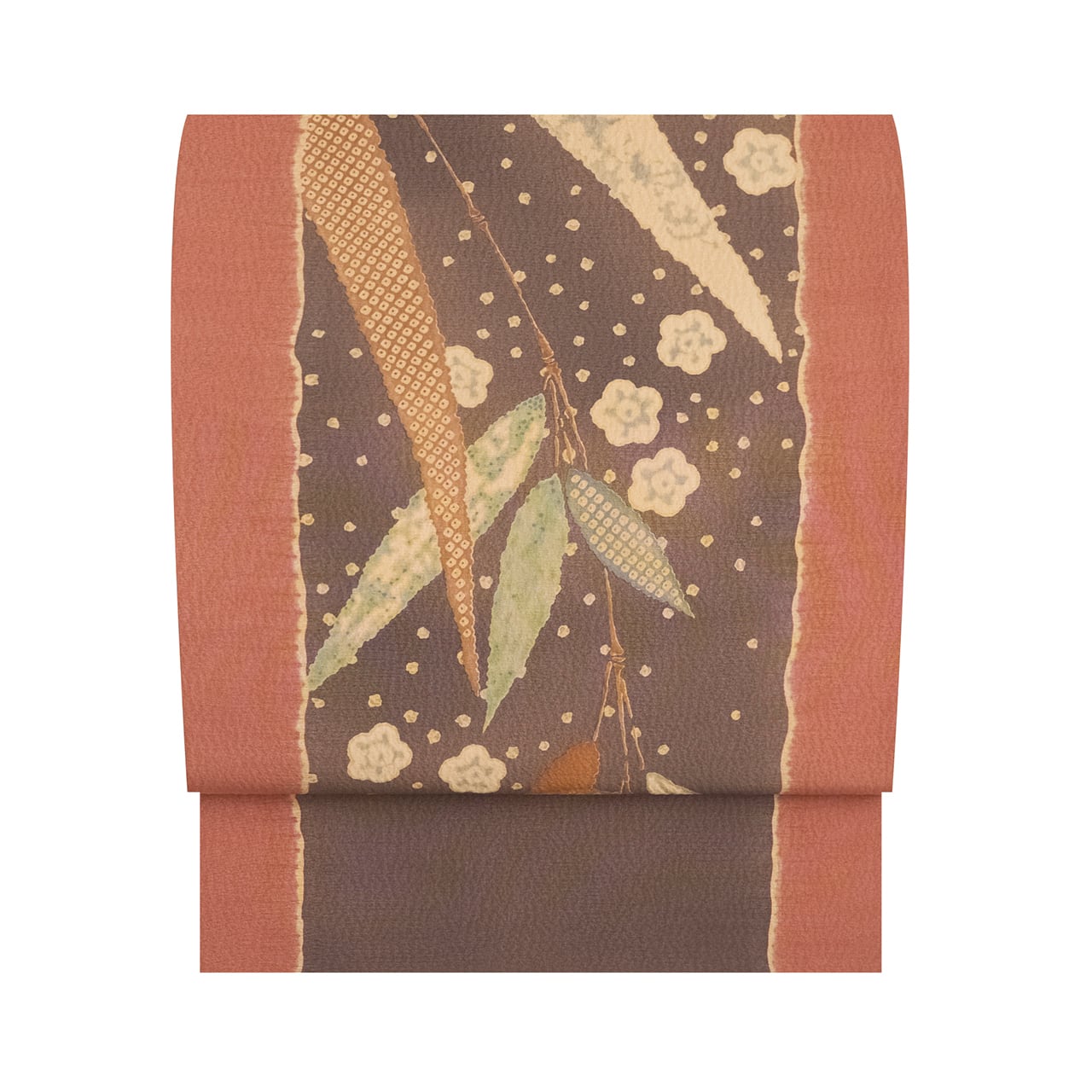 縦にシボのあるさらっとした質感の多ち花さんオリジナルの生地が、両端5cmくらいを絞り染めで蘇芳香色に染め分けられ、その中はグレー味のある薄茶・紅消鼠に染められ、お太鼓には大きく枝垂れる笹の葉が描かれています。