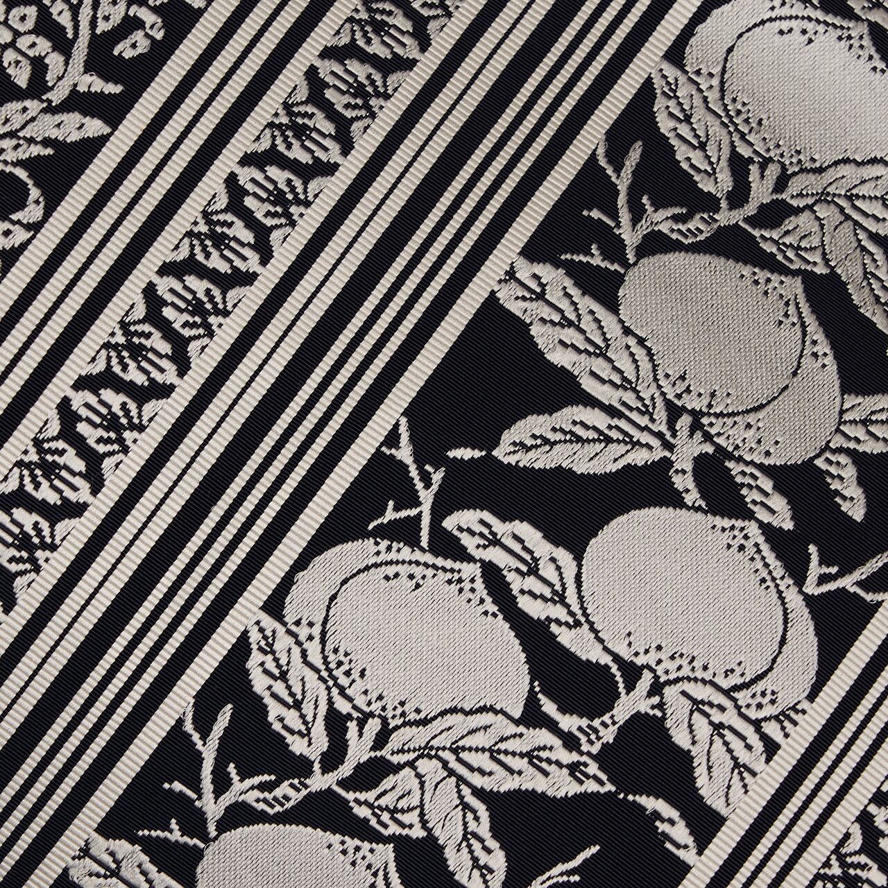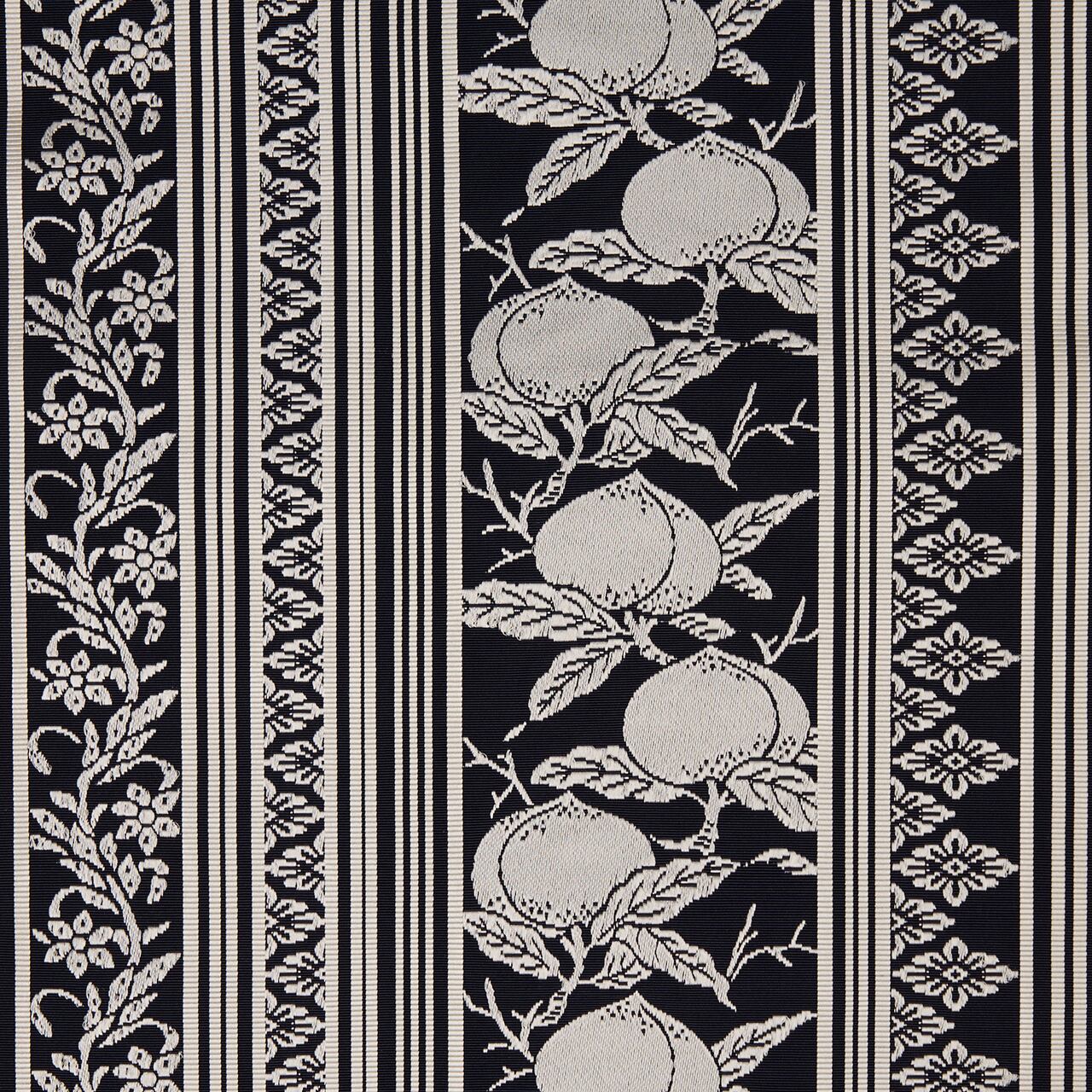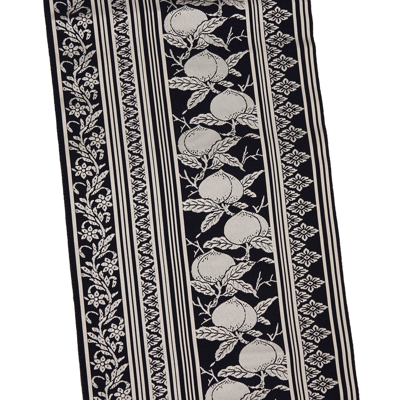 黒地のしっかりとした打ち込みの地に縦縞が何本も織られ、中心の黒の無地の縞には立派な桃が白梅鼠色でたっぷりと織り出され、その両側の縞には花菱の模様が、そして左端の縞には花唐草の模様が織り込まれた、メリハリのはっきりとした素敵な八寸名古屋帯です。