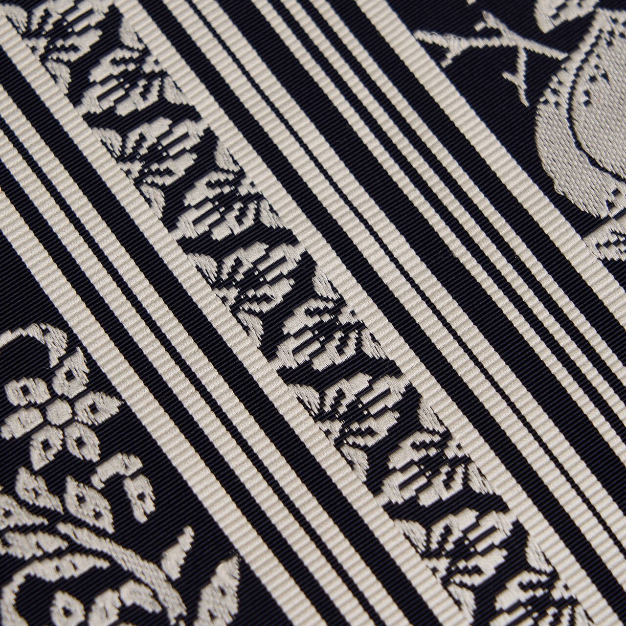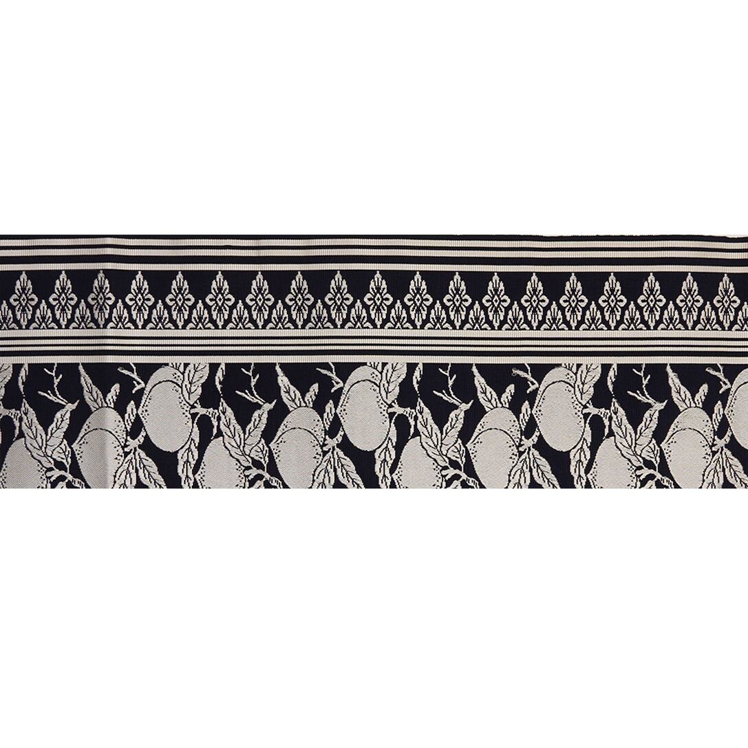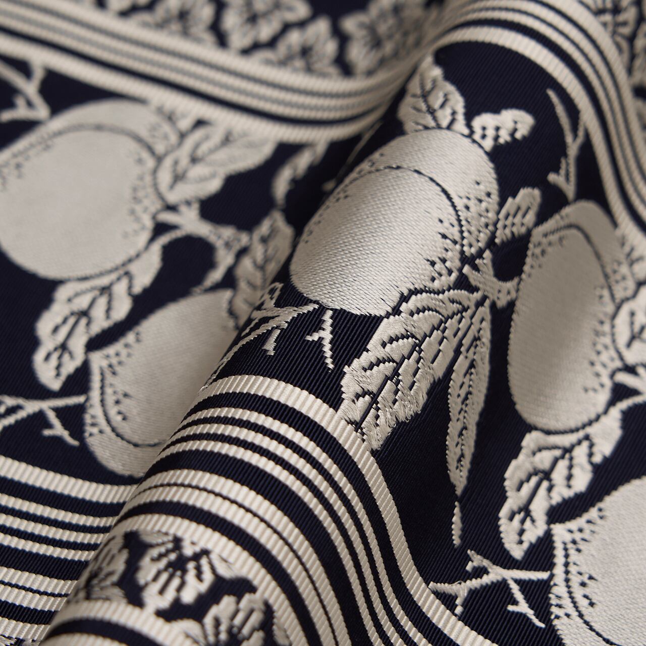 黒地のしっかりとした打ち込みの地に縦縞が何本も織られ、中心の黒の無地の縞には立派な桃が白梅鼠色でたっぷりと織り出され、その両側の縞には花菱の模様が、そして左端の縞には花唐草の模様が織り込まれた、メリハリのはっきりとした素敵な八寸名古屋帯です。