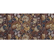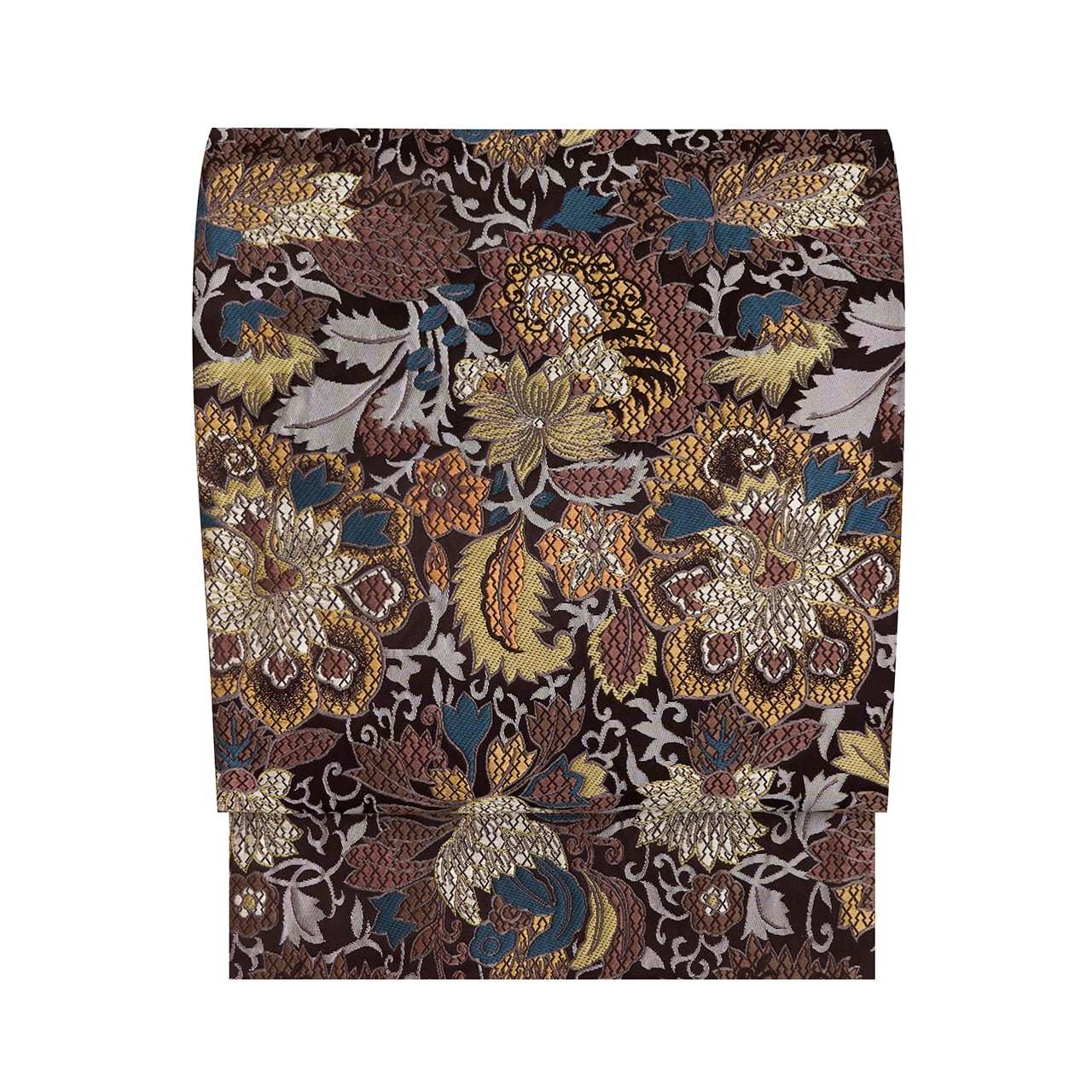 少しだけ赤味のある濃い焦茶・赤墨色の、繻子のような光沢のあるシュルっとした地に、銀鼠色の糸で蔓草と葉が織られ、シックな彩りで大胆な調子の唐花が、唐織のような浮き織で織り出された、ボリューム感のあるお洒落な袋帯です。