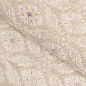 とても細かい斜め格子のような地模様が織り出された灰白色の地に、生成り色の糸で小葵文様が唐織で織り込まれ、ところどころのお花の中心に紫苑色の糸が織り込まれたり、金糸や銀糸があしらわれたりと少し変化も感じられる、とても品格のある素敵な九寸名古屋帯です。