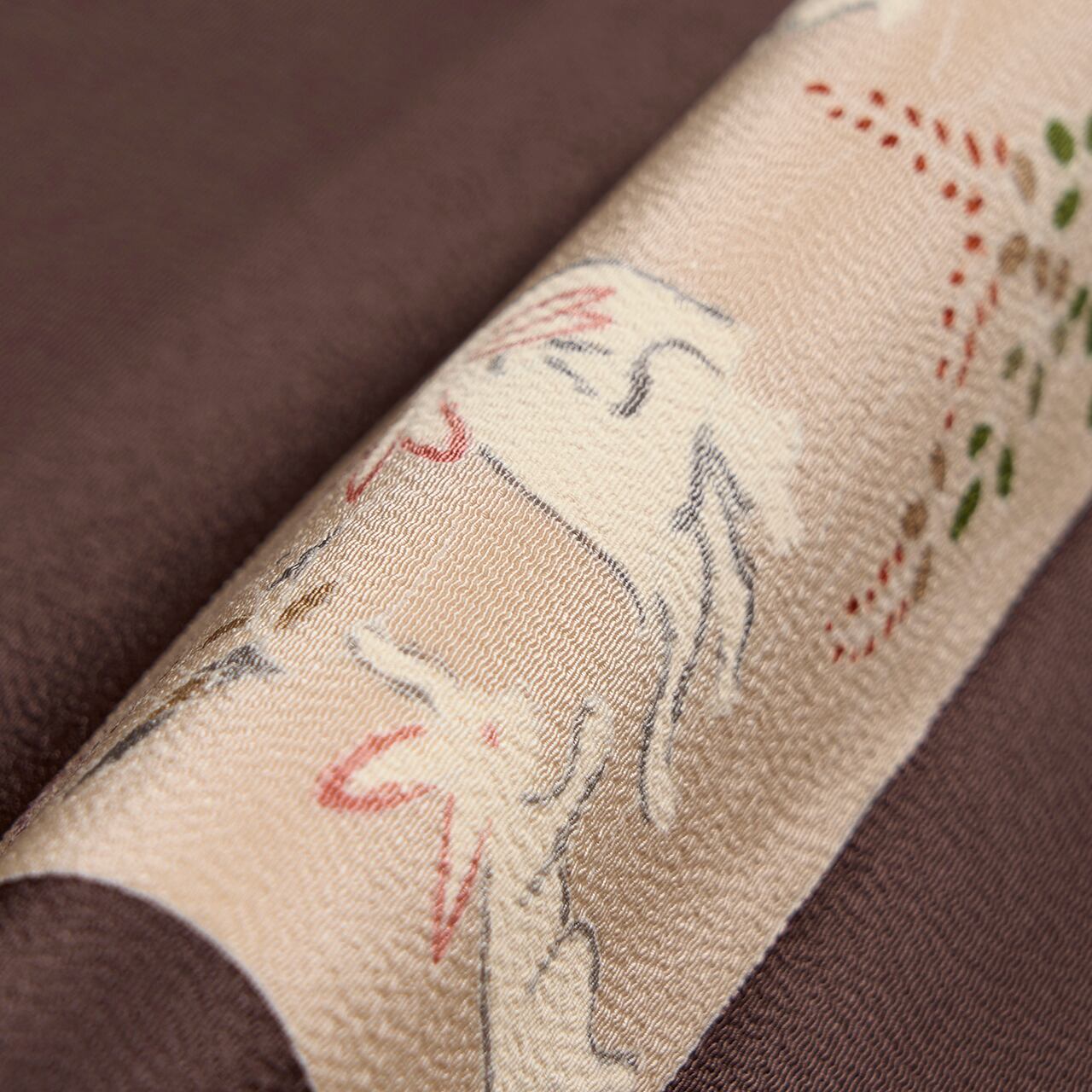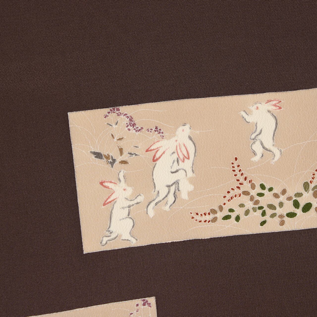 あまりシボが強くないちりめんの生地が、少しだけ赤味のある淡い焦げ茶・黒鳶色に染められ、お太鼓に2つ取られた長四角が砂色のベージュに染められて、草花が咲く野原に白いうさぎたちがのんびりと寝転がったり、お相撲をとって遊んでいたりする様子が友禅で描かれた、微笑ましく可愛らしい九寸名古屋帯です。