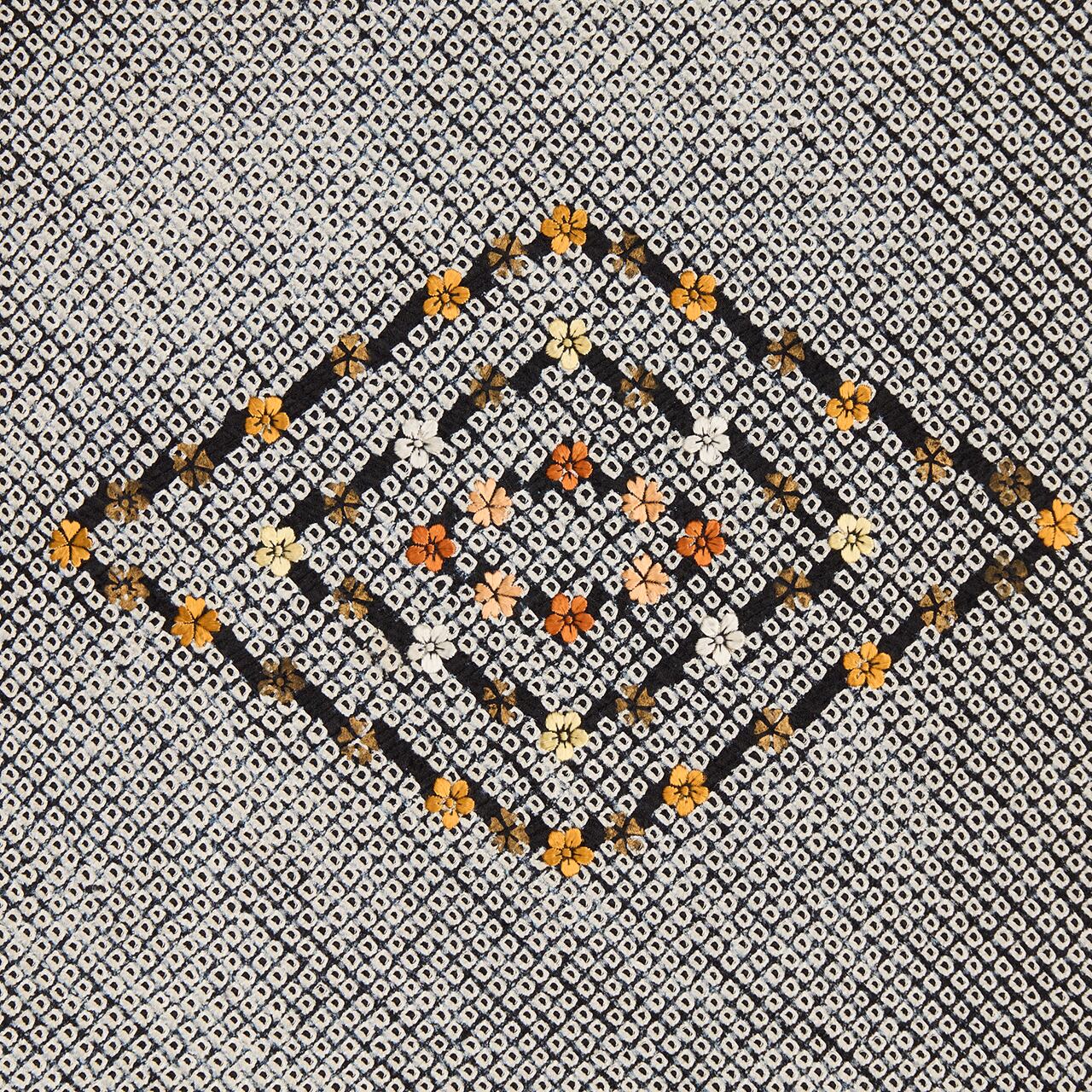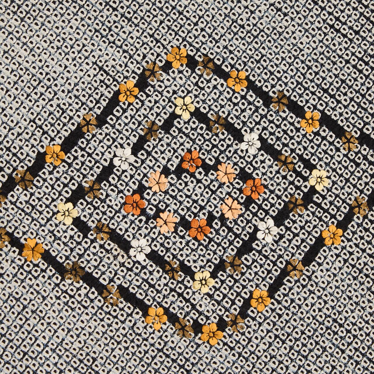 疋田絞りの手仕事の味わいがとてもよく感じられるデザインとなっていて、菱の模様に沿ってあしらわれた手刺繍のお花の可憐さが上品な華やかさを醸し出した、雅な雰囲気のあるお洒落な帯となっています。