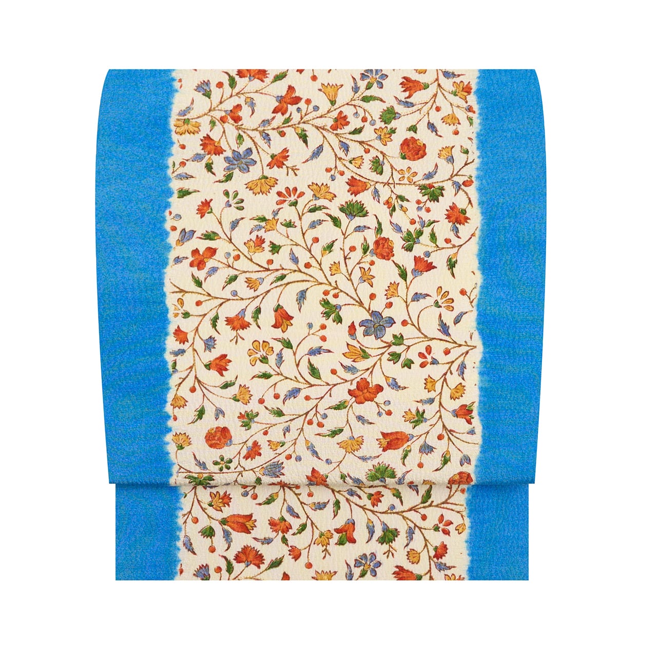 縦にシボのあるさらっとした質感の多ち花さんオリジナルの象牙色の生地の両端に、5cmくらいの幅で綺麗なブルー・縹色が絞りで染め分けられ、その間に小さなお花を咲かせた花唐草の模様が摺型友禅で描かれた、とても清々しい印象の素敵な九寸名古屋帯です。