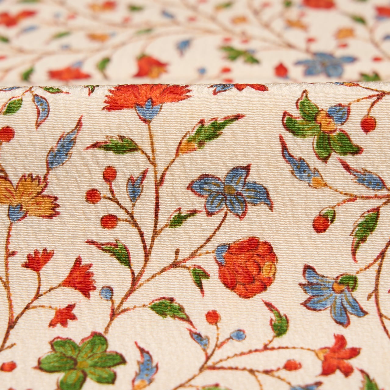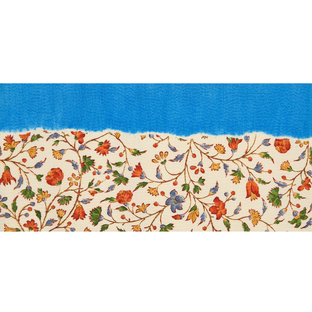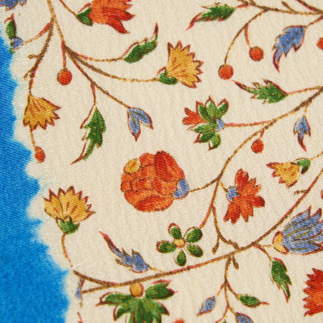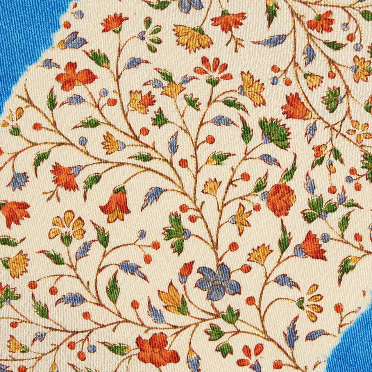 花唐草は茜色や芥子色、千歳緑、熨斗目花色と色とりどりで、手描きの更紗のように染められていて、両端の青とのコントラストもとても綺麗なメリハリのある色使いとなっています。