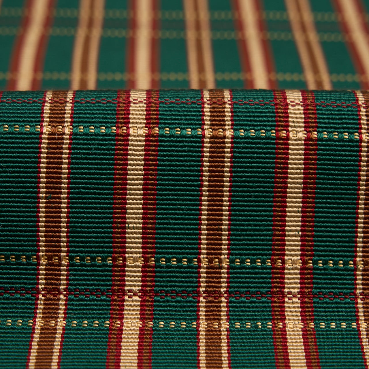 少し太い緯糸が使われているようで、凹凸感があり、縦縞の灰白色や黒鳶色の部分が真田織のような雰囲気となっているのも素敵です。