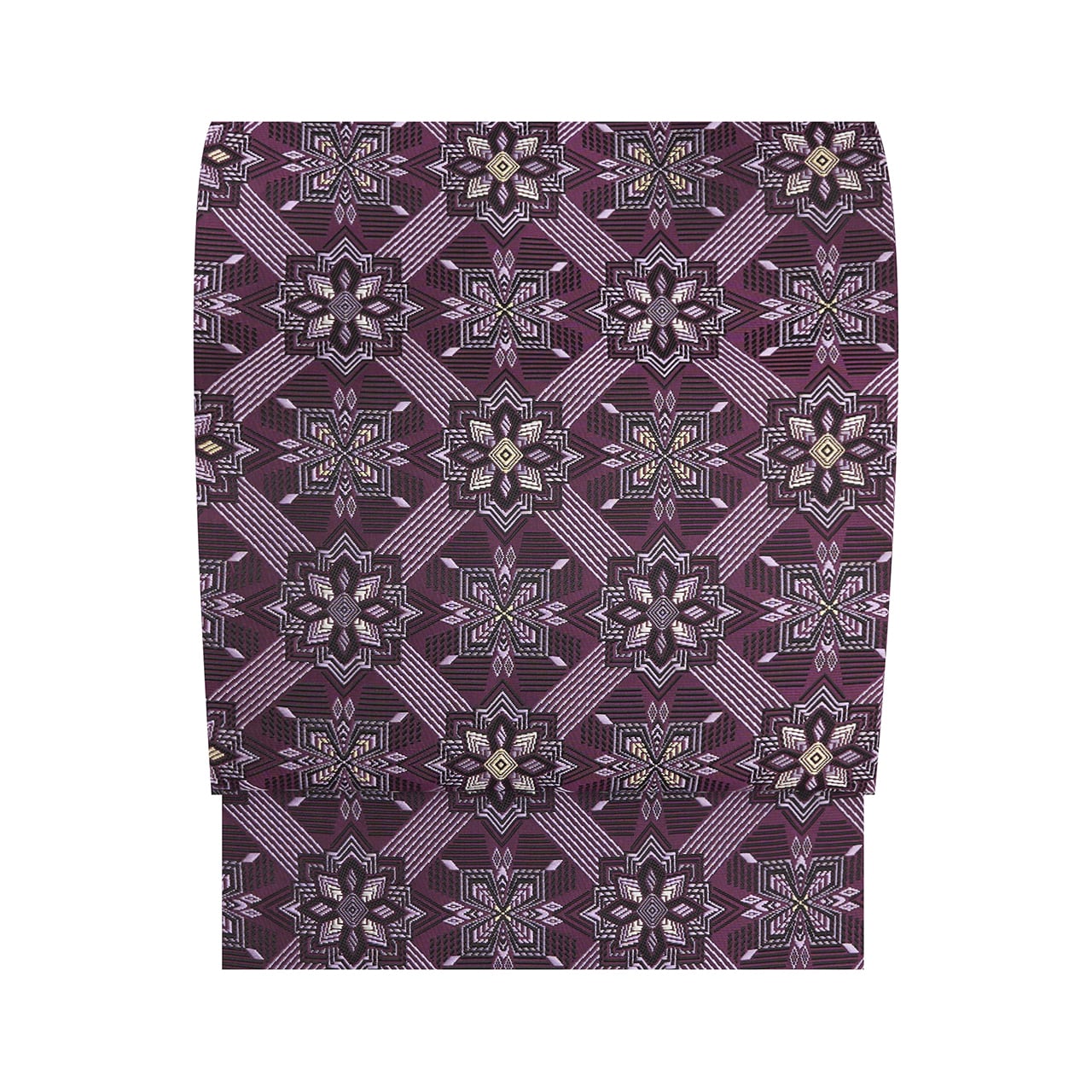 しなやかな質感に織られた紫紺色の赤味のある紫の地に、半色の淡い藤色の細縞の集合で斜め格子が取られ、それが交差するところには多角形の星型のような、メダリオンの中心のような模様が織り出され、格子の中にはまた違った形の4枚の花びらのような星型の模様が織り込まれた、キリッとしたシャープな印象の八寸名古屋帯です。