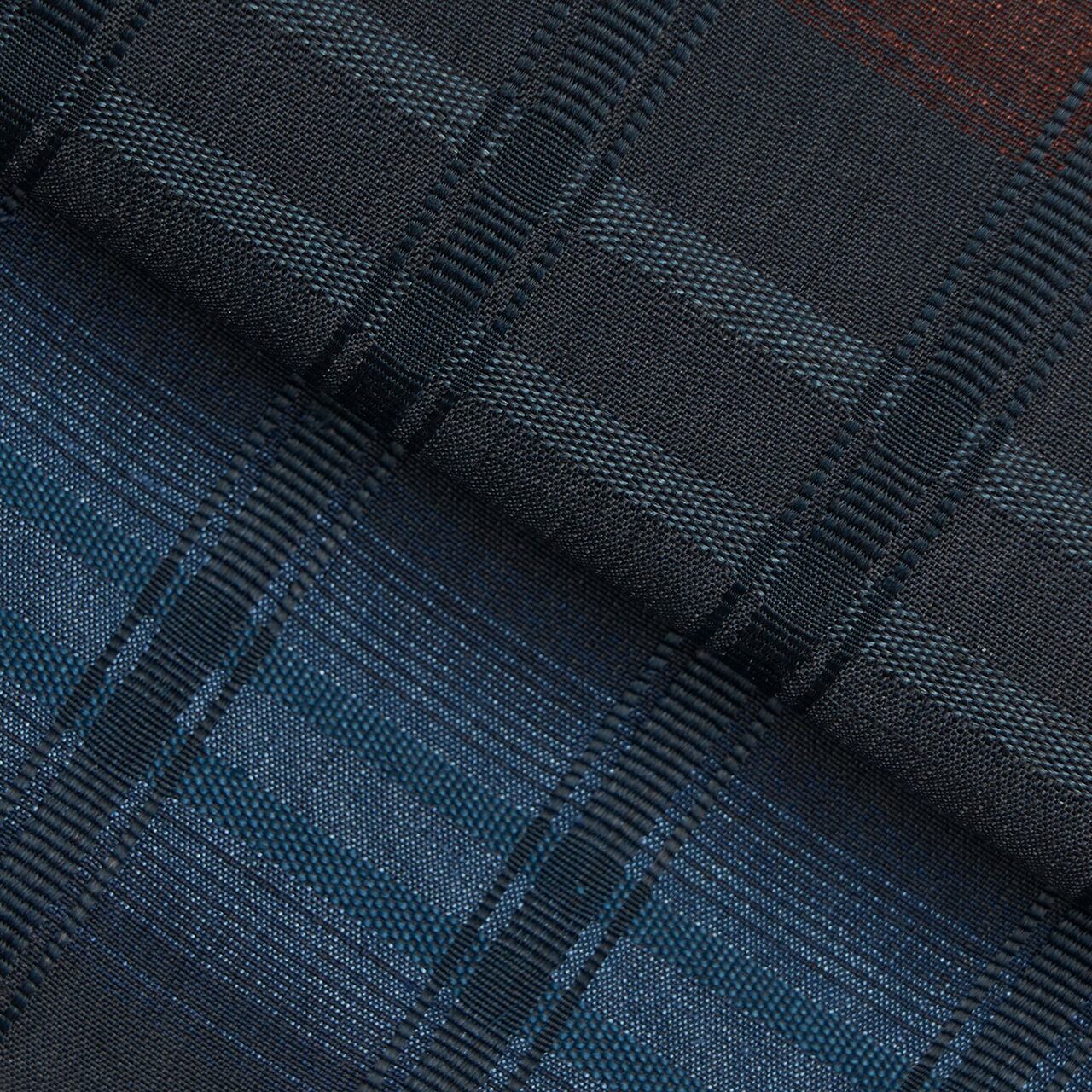 少しだけ藍味のある濃い緑・百入茶色の地に、同色の糸で縦縞のように真田織が織り込まれ、横にもやはり同色の糸で細かい浮き織のような縞と、段変わりに錆色の赤茶や茶鼠色のグレーベージュ、藍鼠色などの暈しが施されて、それらが交差するところには吉野織ならではの独特の形が現れて味わい深いものとなったお洒落な九寸名古屋帯です。