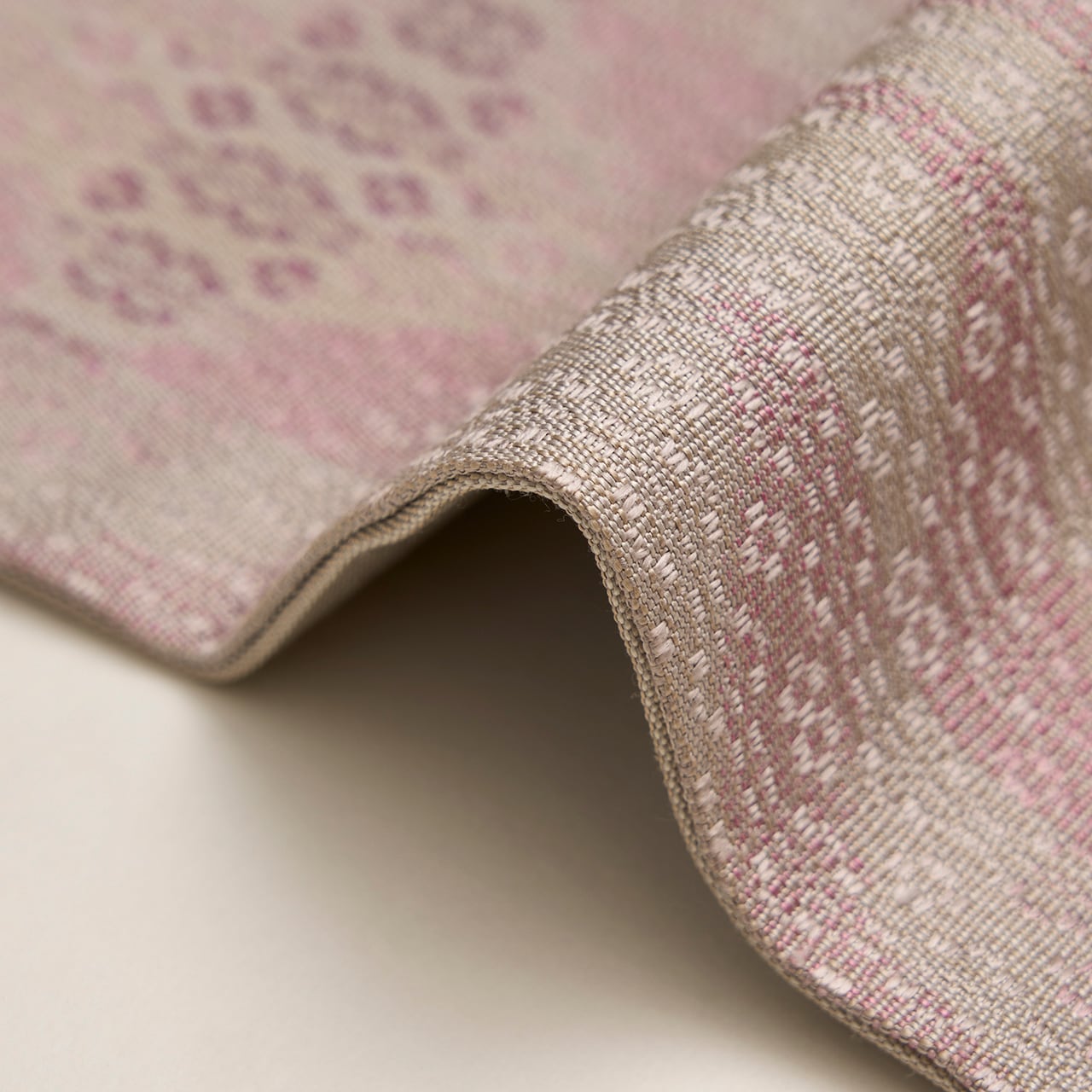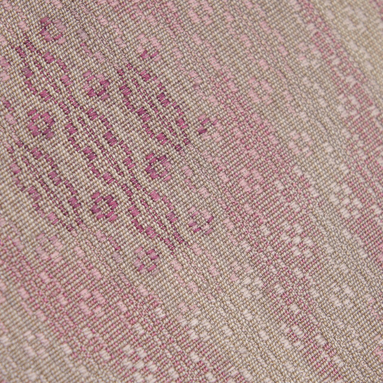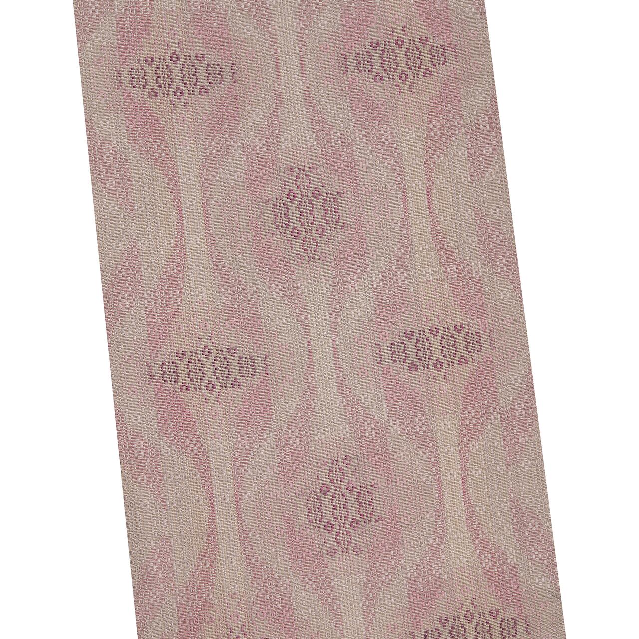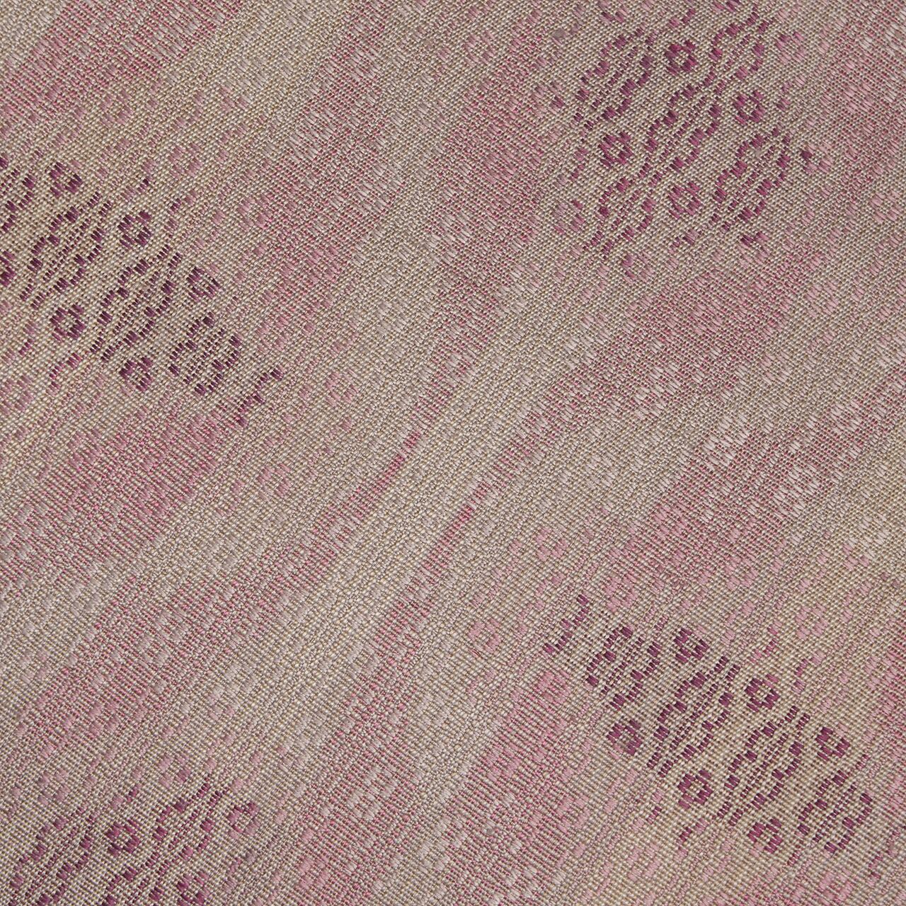 全体的に浮き織が施された、淡く綺麗なグレー・潤色の地に、淡い薄紫・紅藤色で霞のように儚い立涌の模様が織り出され、その枠の中には濃い赤紫・蒲葡色の浮き織がお花のように並んで暈しのように織り出された、とても複雑な織りを実現されている、工芸的な良さのあふれる九寸の開名古屋帯です。