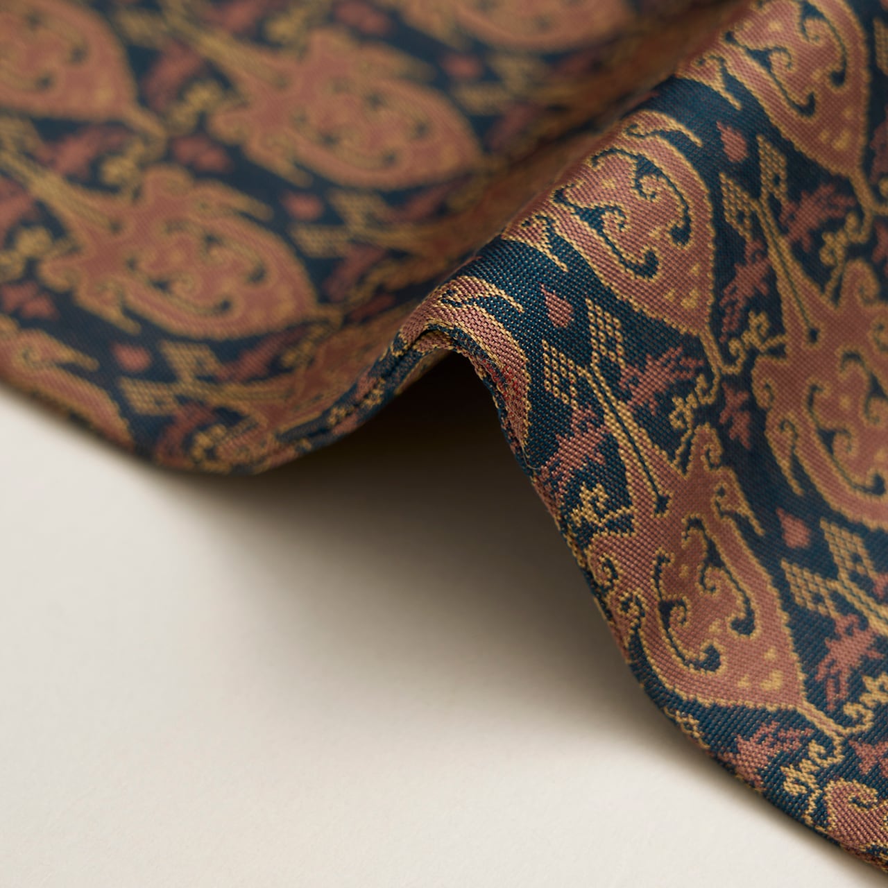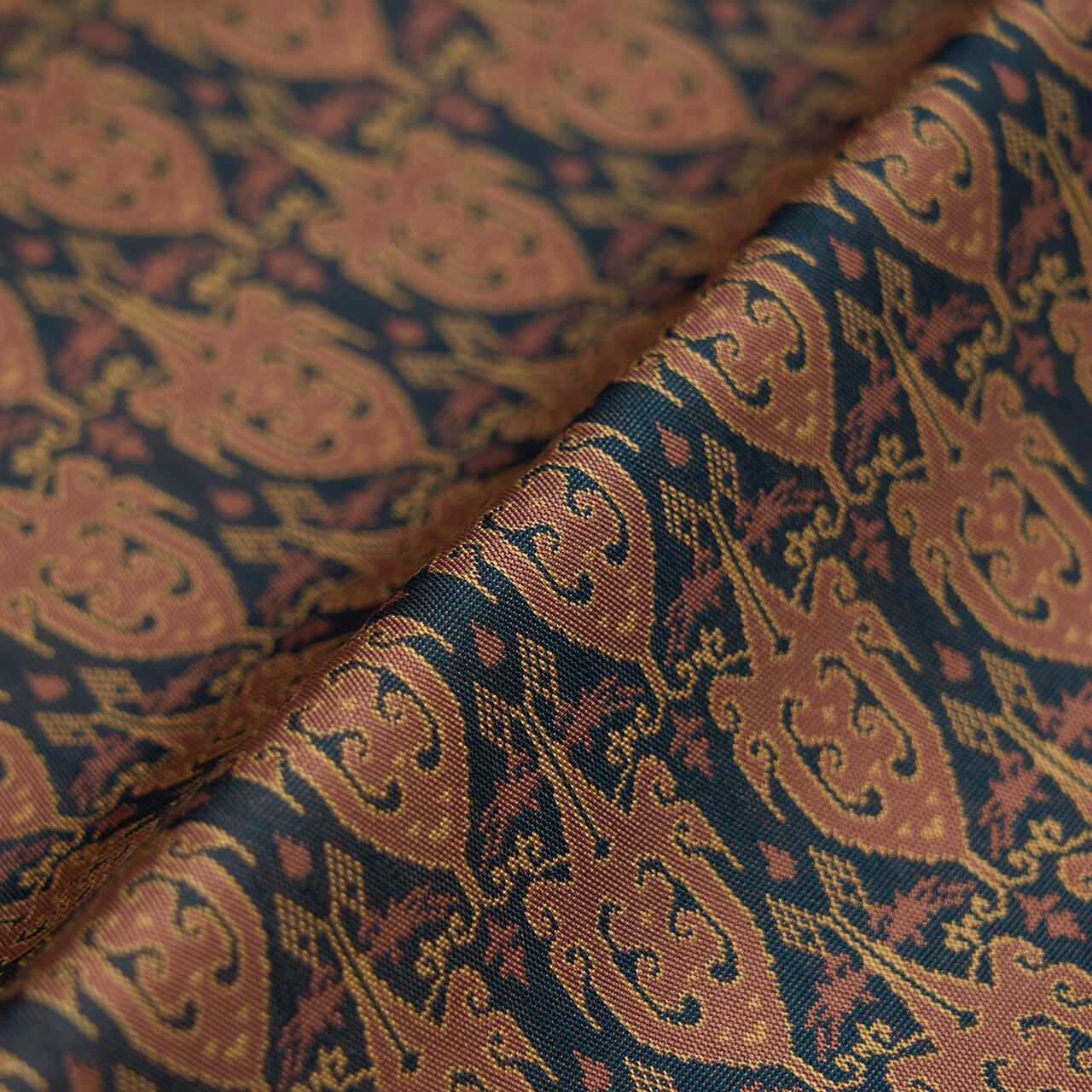 動物などをモチーフにしたものが多く見られ、それを図案化したこちらの文様は、シベリアのバイカル湖畔の匈奴(きょうど)遺跡から発掘された、漢代の経錦の織物から取材して龍村さんで復元されたもののようです。