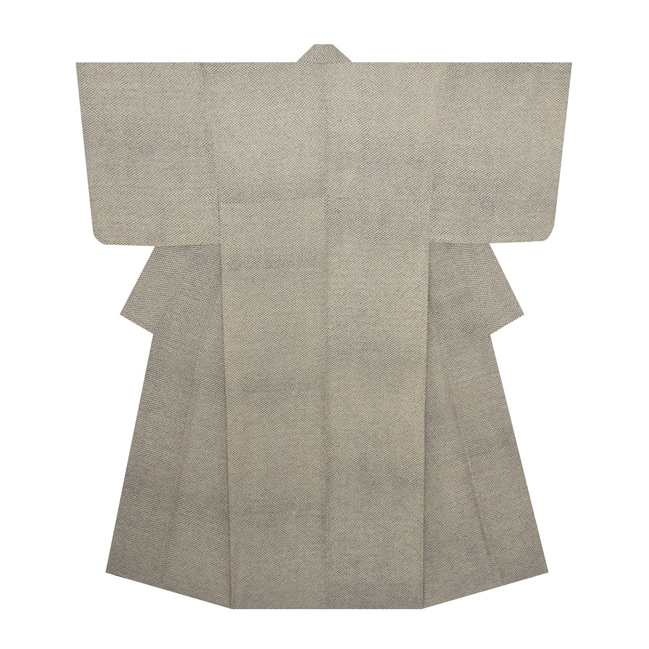 紗綾型の地模様のある紋意匠の生地に、細かな疋田模様がびっしりと手描きで描かれた、味わいの感じられる総柄の小紋のお着物です。