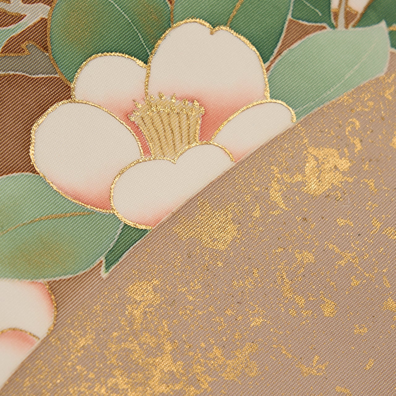 椿のお花は胡粉で生成り色に色付けされてくっきりと白く際立つように描かれ、葉の緑色も岩絵の具のような青磁系の緑色が濃淡で染められて、まるで日本画を見ているような美しさが感じられます。