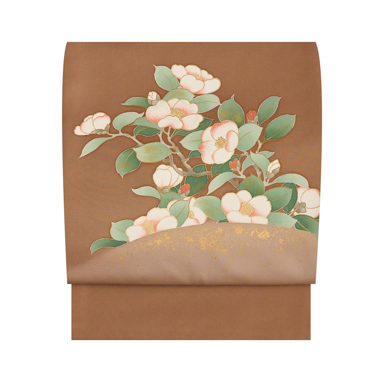 少し赤味のある薄めの茶・丁字染色のしっかりとした塩瀬の生地のお太鼓に、たっぷりとした白い椿のお花がたくさん咲いている様子が手描きの友禅で見事に描かれ、お花には薄紅色の暈しが入れられ、部分的に手刺繍が施され、その薄紅色の暈しも刺繍で表されているといった、手の込んだとても素敵な九寸の開名古屋帯です。
