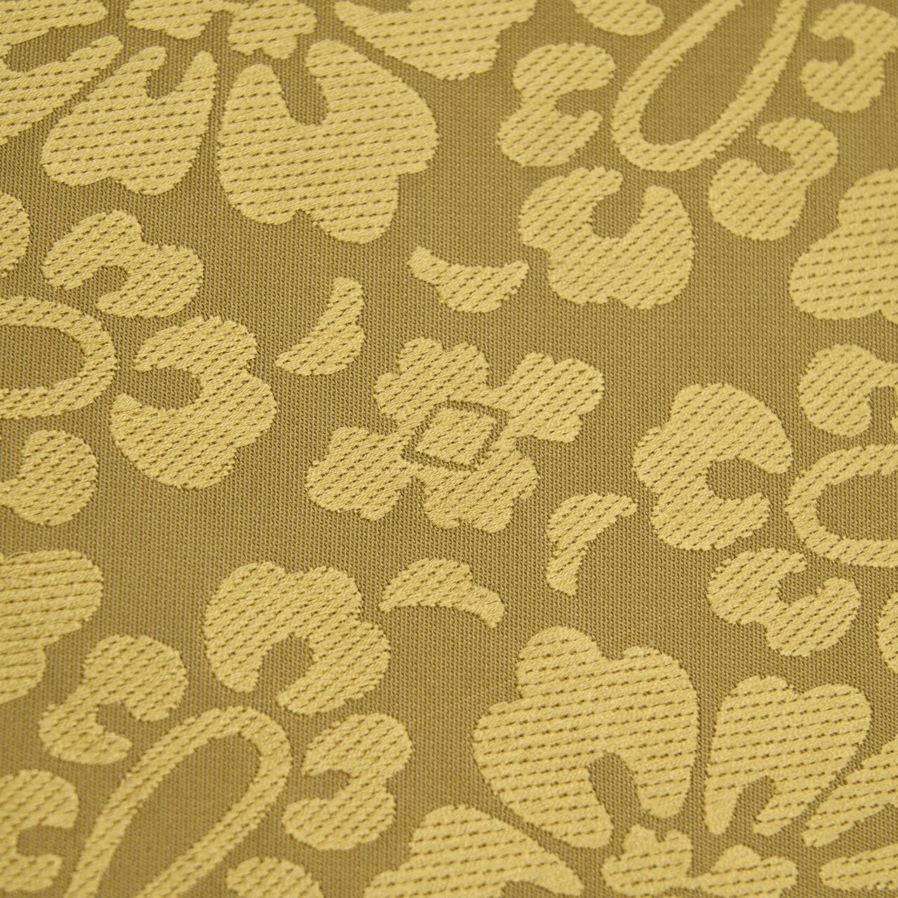 極細の糸をたくさん使って織られたシャリっとした質感の、ほんの少し緑味を感じられる黄茶・桑染色の地に、同色の錦の糸で中型の大きさの小葵文が浮き織にされた、有職文様ならではの格調高さのある素敵な全通の袋帯です。