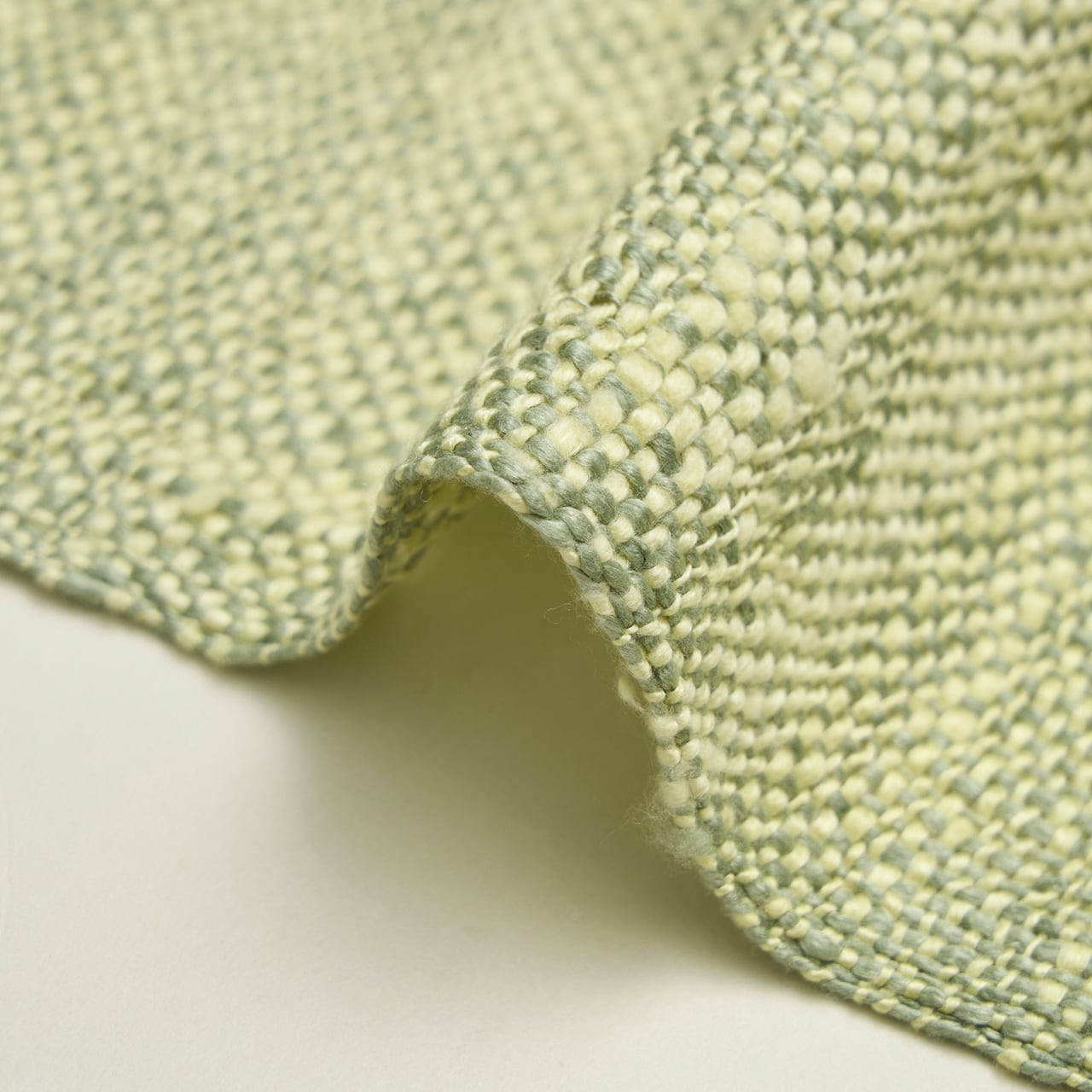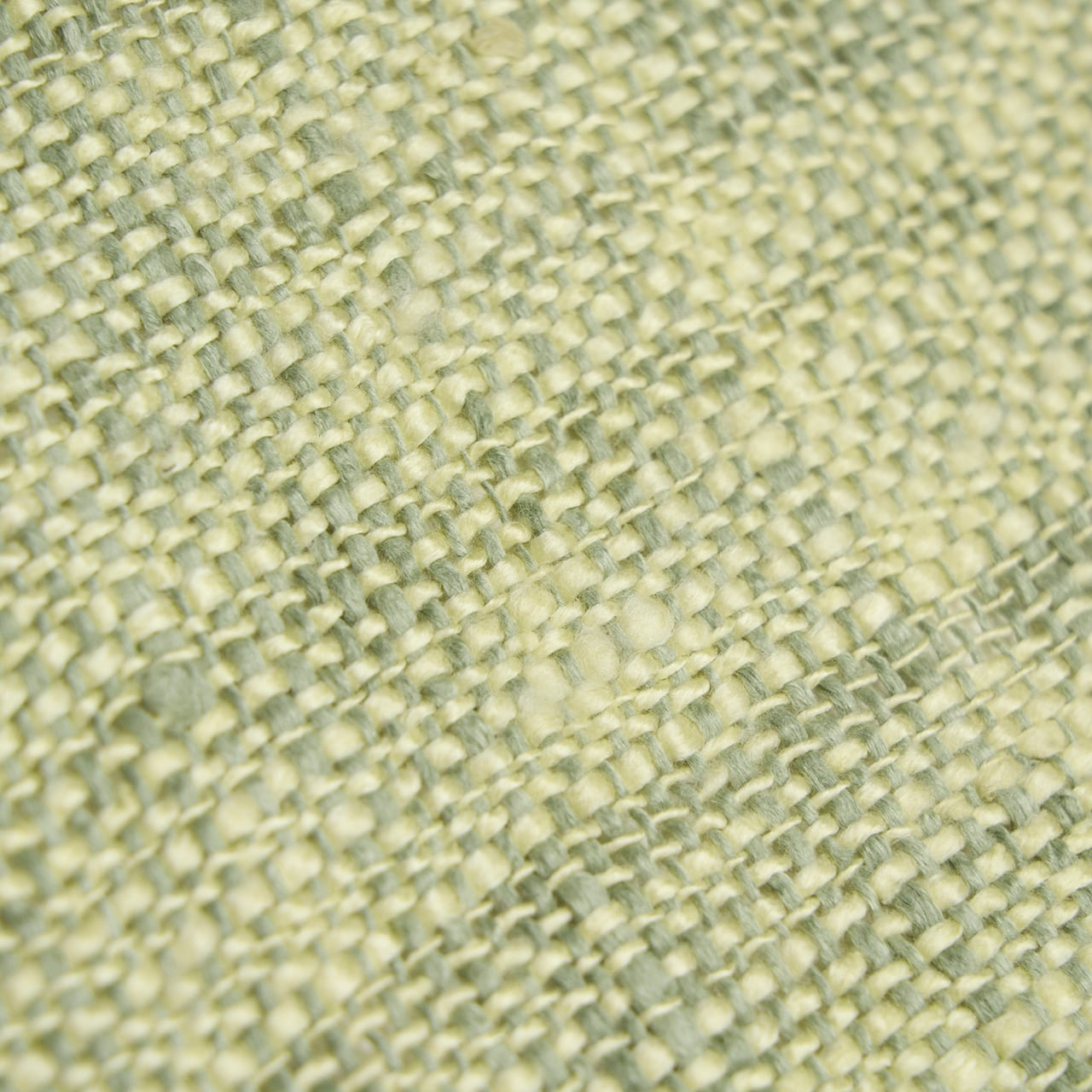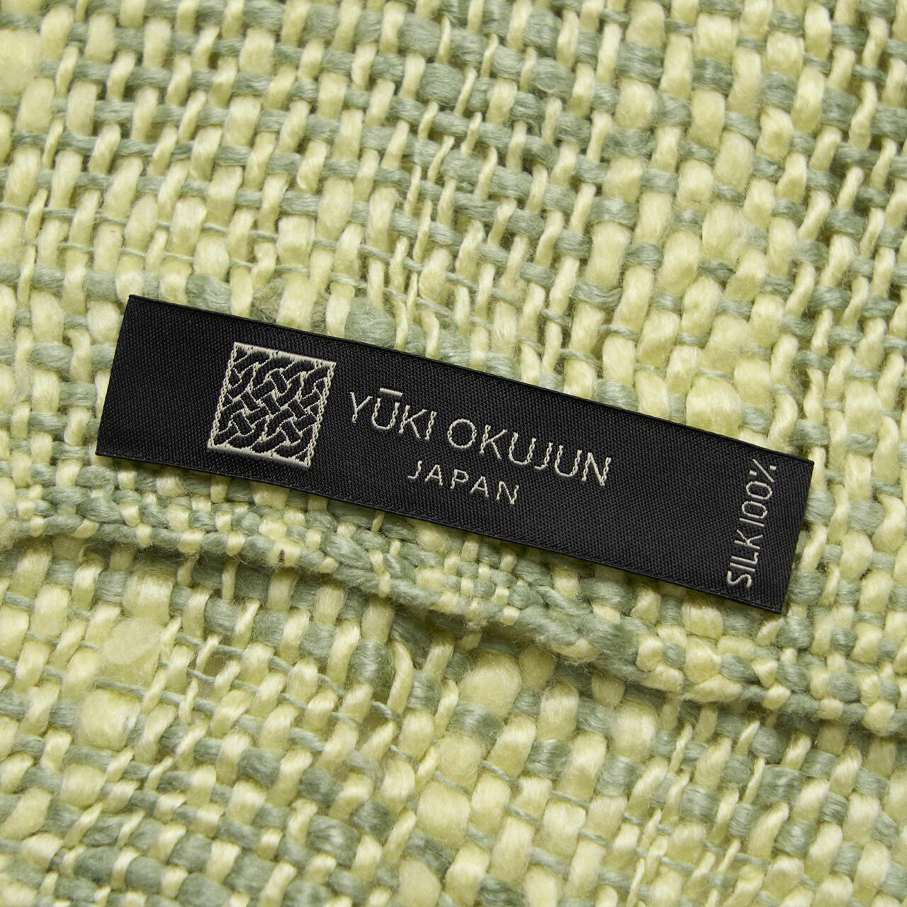 経糸は明るい青味のある緑・青白橡色の糸で、緯糸は天蚕糸のような黄色味のある薄緑・若芽色の糸が手紡ぎされたものが使われて、手織りされています。